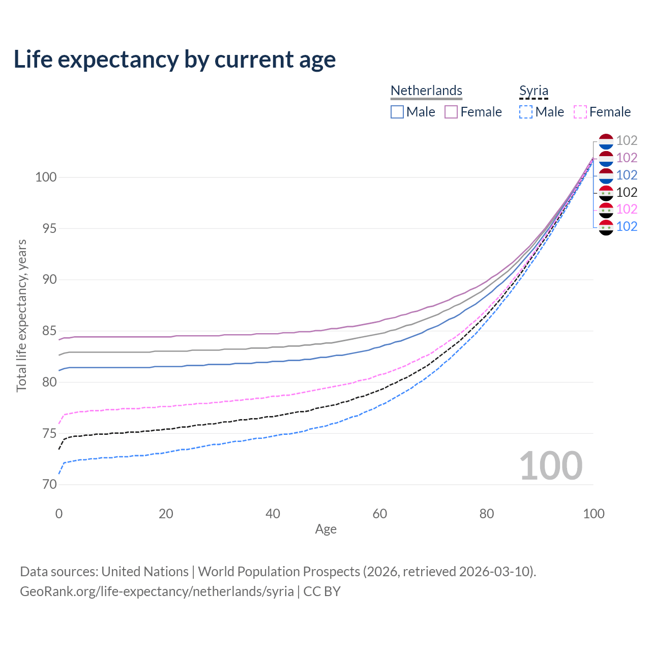 This life expectancy calculator shows the odds of living to 100, 95, 90, and below based on current age for both males and females in the Netherlands and Syria, along with mean and median age of death. The calculations are based on the 2026 life tables (actuarial tables) from the UN World Population Prospects.