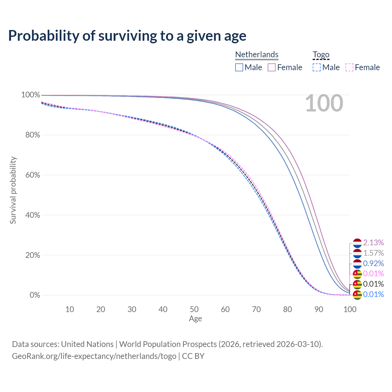 This life expectancy calculator shows the odds of living to 100, 95, 90, and below based on current age for both males and females in the Netherlands and Togo, along with mean and median age of death. The calculations are based on the 2026 life tables (actuarial tables) from the UN World Population Prospects.