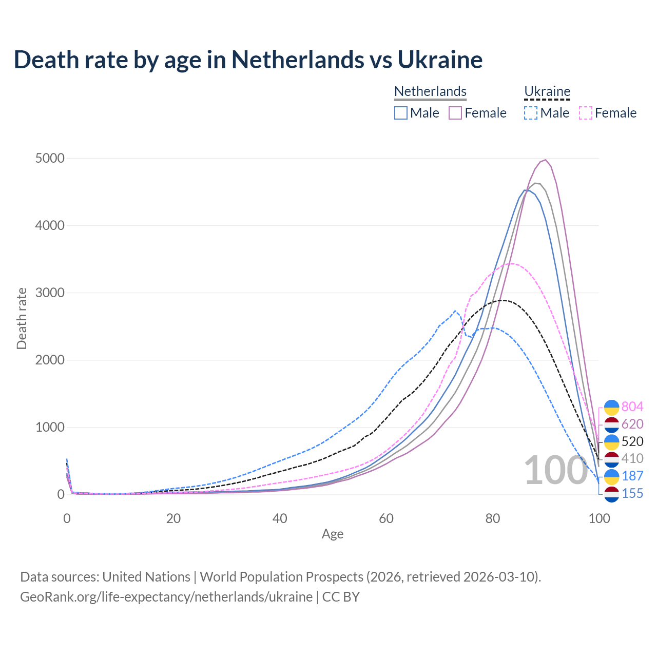 In the Netherlands, the most common age of death is 88, compared to 82 in Ukraine. The median age of death is 85.5 in the Netherlands and 78 in Ukraine, meaning only half of each cohort is expected to live past that age.