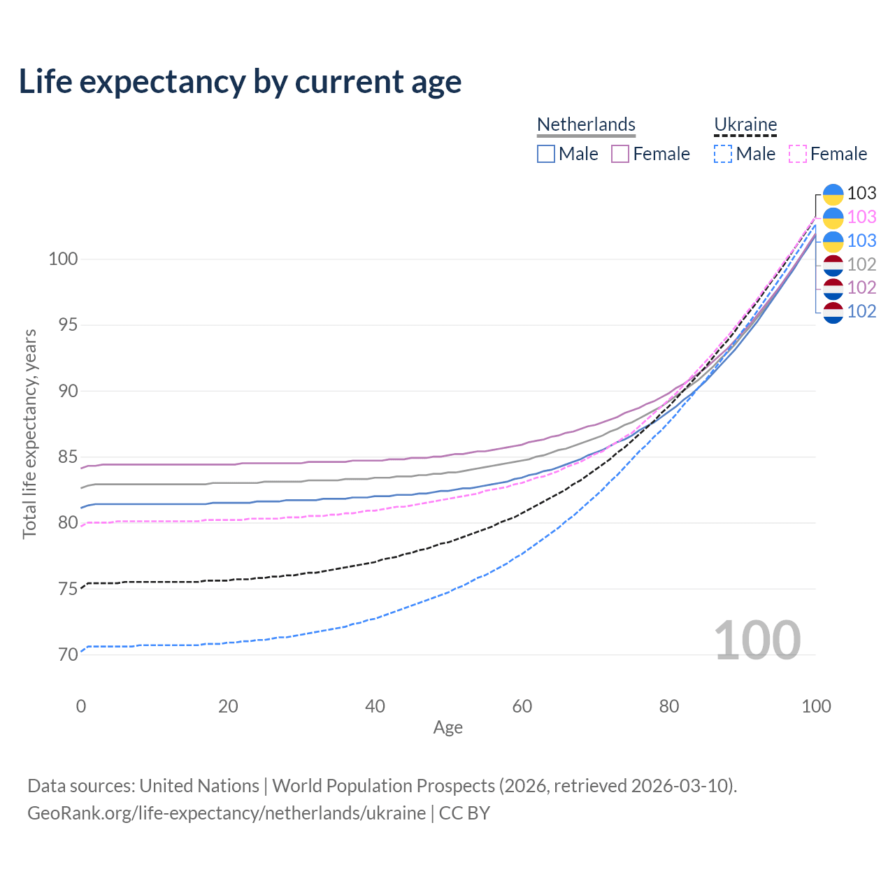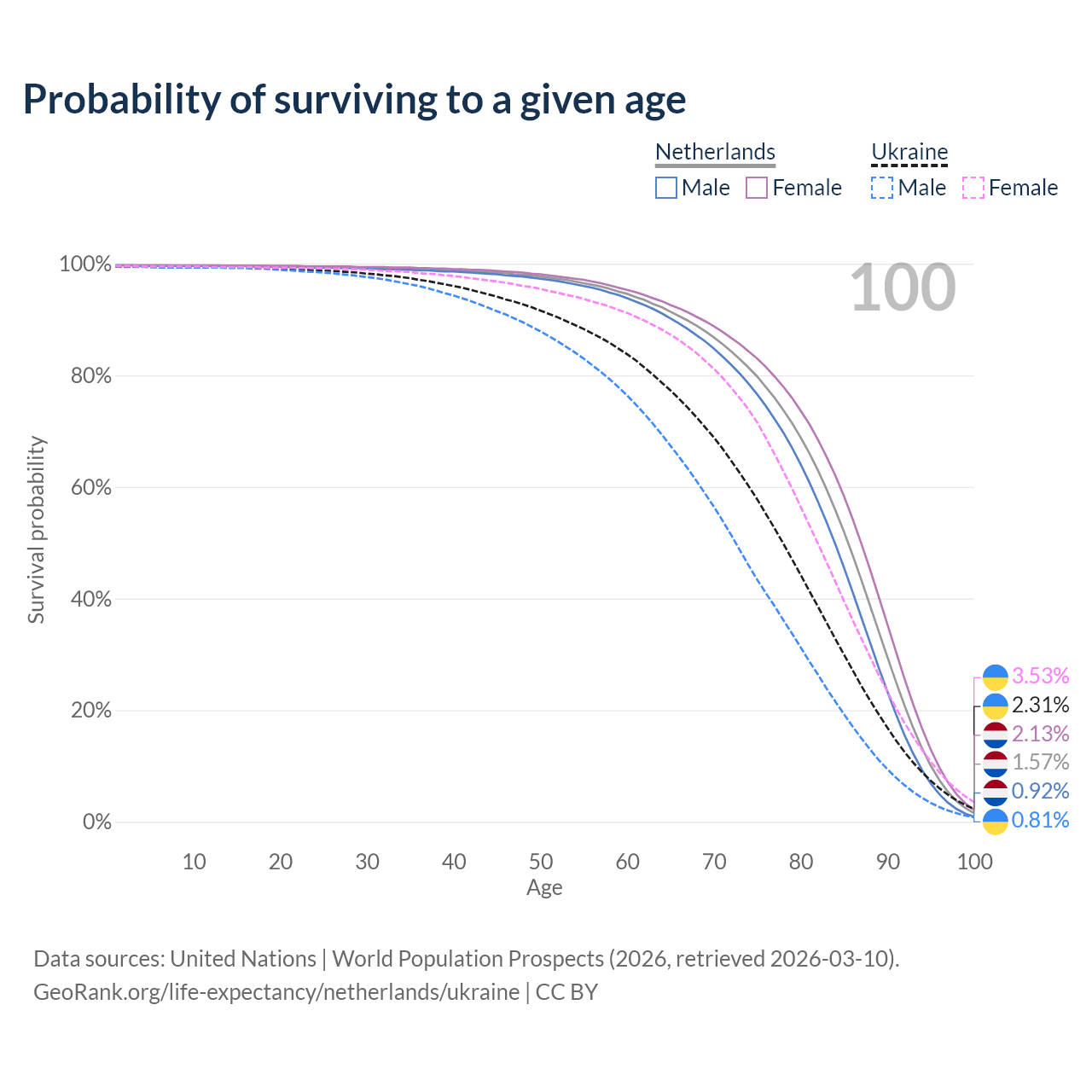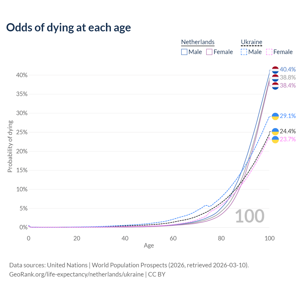 This life expectancy calculator shows the odds of living to 100, 95, 90, and below based on current age for both males and females in the Netherlands and Ukraine, along with mean and median age of death. The calculations are based on the 2026 life tables (actuarial tables) from the UN World Population Prospects.