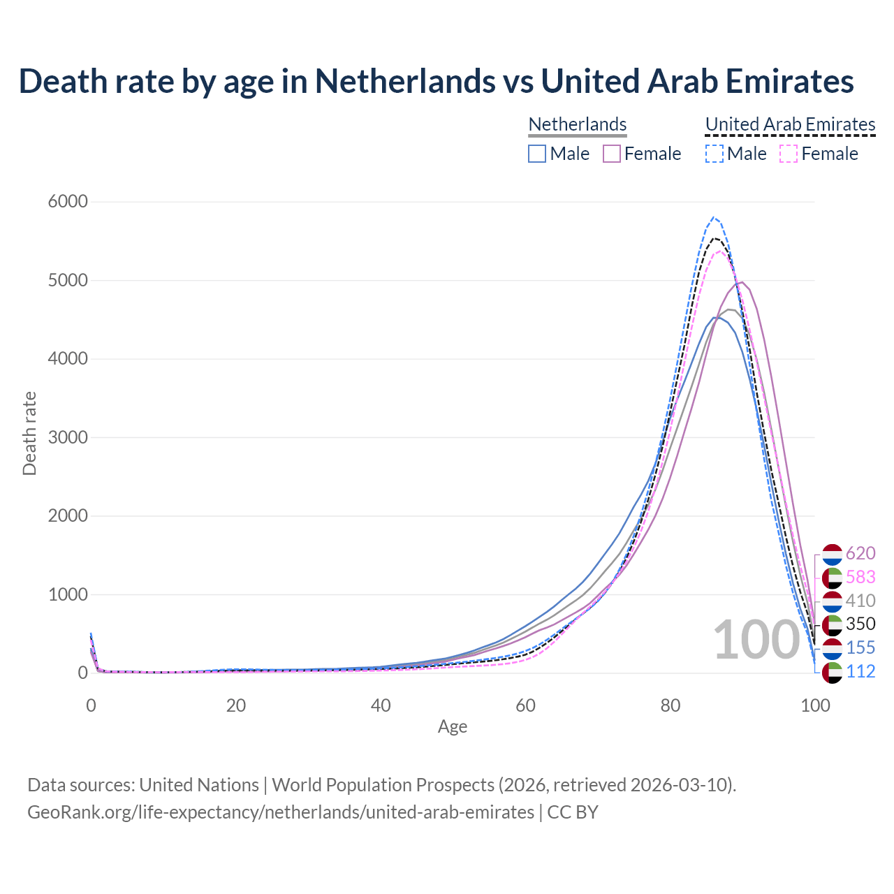 In the Netherlands, the most common age of death is 88, compared to 86 in the United Arab Emirates. The median age of death is 85.5 in the Netherlands and 85.6 in the United Arab Emirates, meaning only half of each cohort is expected to live past that age.
