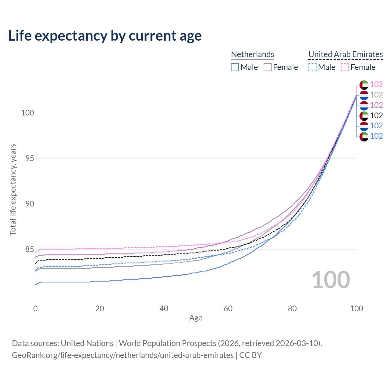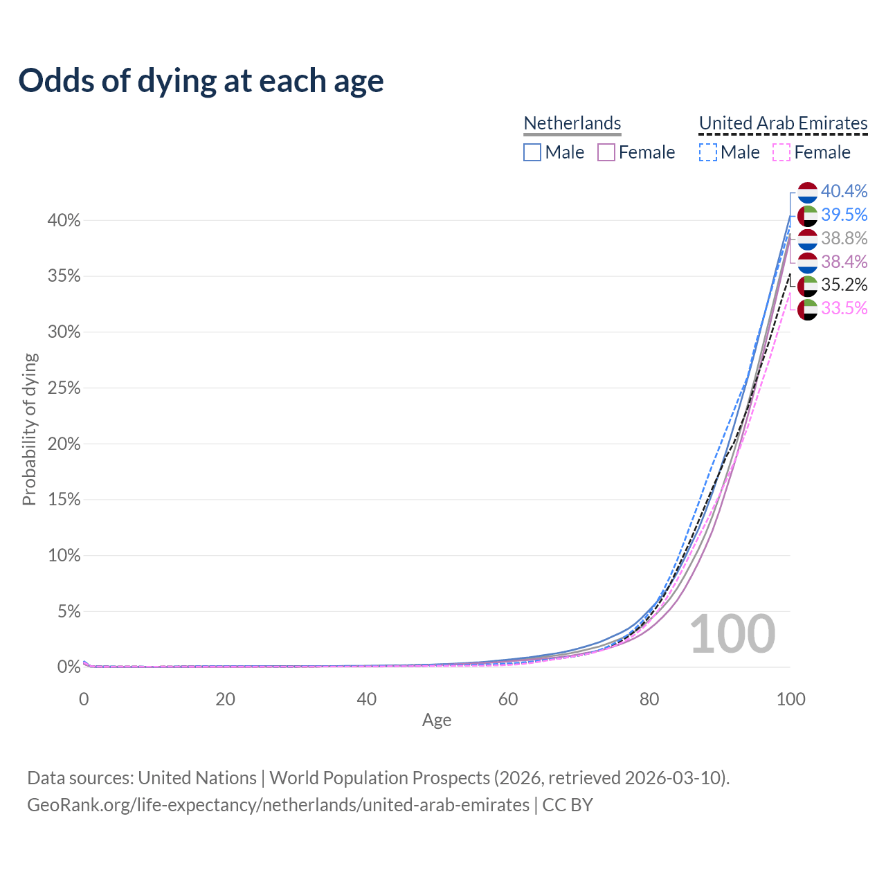 This life expectancy calculator shows the odds of living to 100, 95, 90, and below based on current age for both males and females in the Netherlands and the United Arab Emirates, along with mean and median age of death. The calculations are based on the 2026 life tables (actuarial tables) from the UN World Population Prospects.