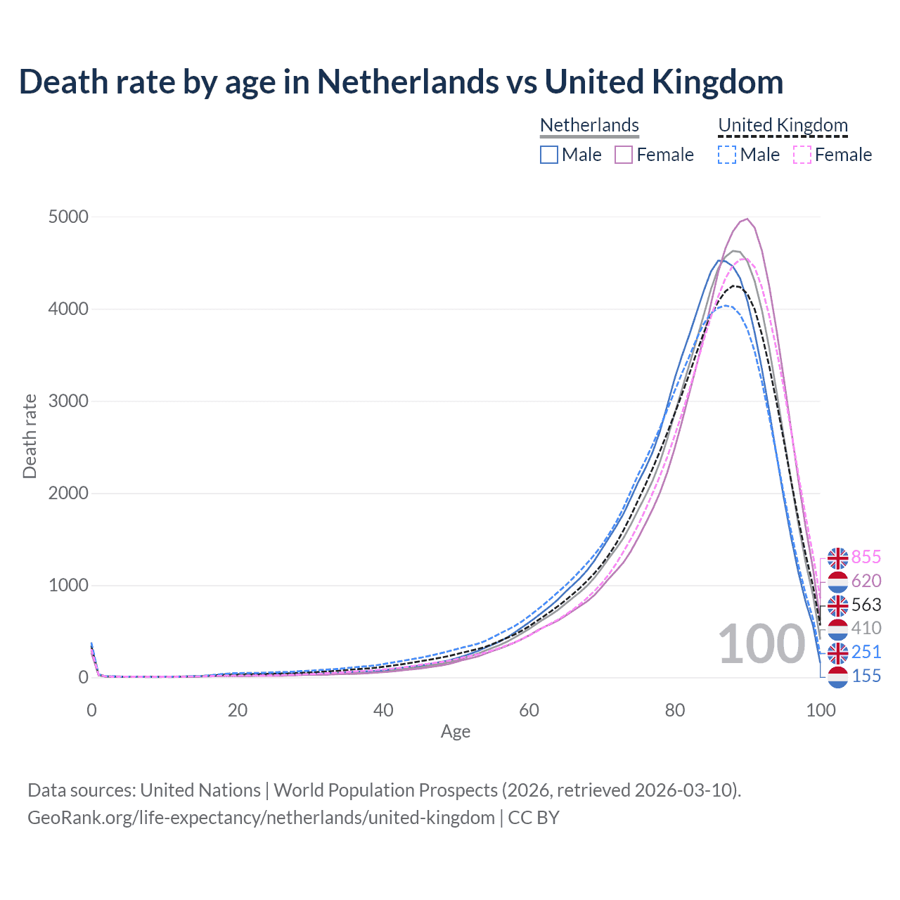 In the Netherlands, the most common age of death is 88, compared to 88 in the United Kingdom. The median age of death is 85.5 in the Netherlands and 84.9 in the United Kingdom, meaning only half of each cohort is expected to live past that age.