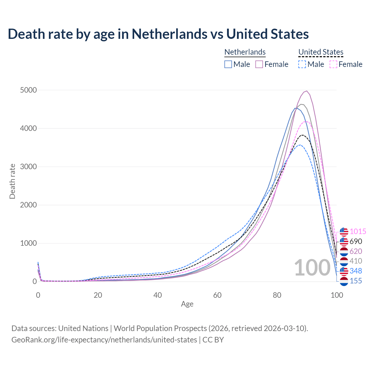 This life expectancy calculator shows the odds of living to 100, 95, 90, and below based on current age for both males and females in the Netherlands and the United States, along with mean and median age of death. The calculations are based on the 2026 life tables (actuarial tables) from the UN World Population Prospects.