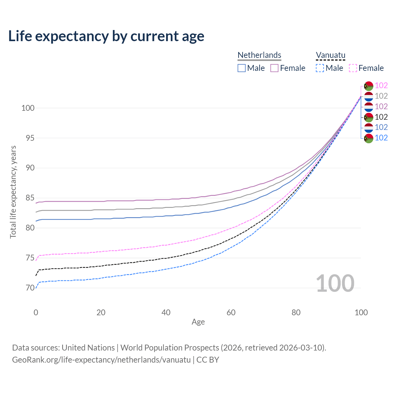 This life expectancy calculator shows the odds of living to 100, 95, 90, and below based on current age for both males and females in the Netherlands and Vanuatu, along with mean and median age of death. The calculations are based on the 2026 life tables (actuarial tables) from the UN World Population Prospects.