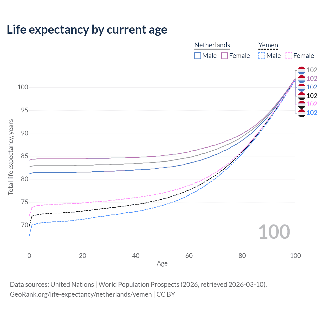This life expectancy calculator shows the odds of living to 100, 95, 90, and below based on current age for both males and females in the Netherlands and Yemen, along with mean and median age of death. The calculations are based on the 2026 life tables (actuarial tables) from the UN World Population Prospects.