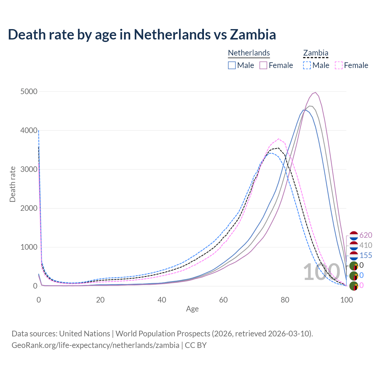 Note that this chart does not show rates per 100,000 population, as those would be skewed by age structure differences and reflect the demographics of the Netherlands and Zambia more than their death rates.