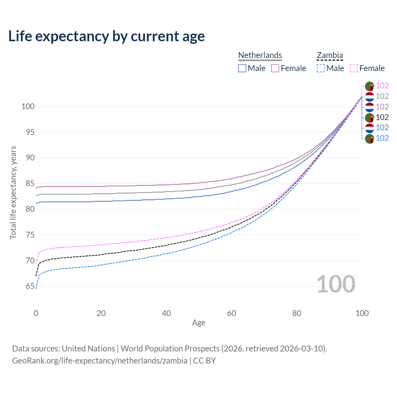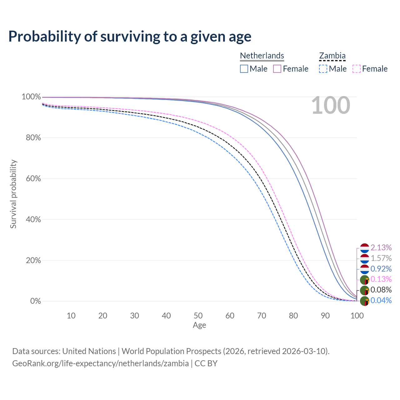 This life expectancy calculator shows the odds of living to 100, 95, 90, and below based on current age for both males and females in the Netherlands and Zambia, along with mean and median age of death. The calculations are based on the 2026 life tables (actuarial tables) from the UN World Population Prospects.