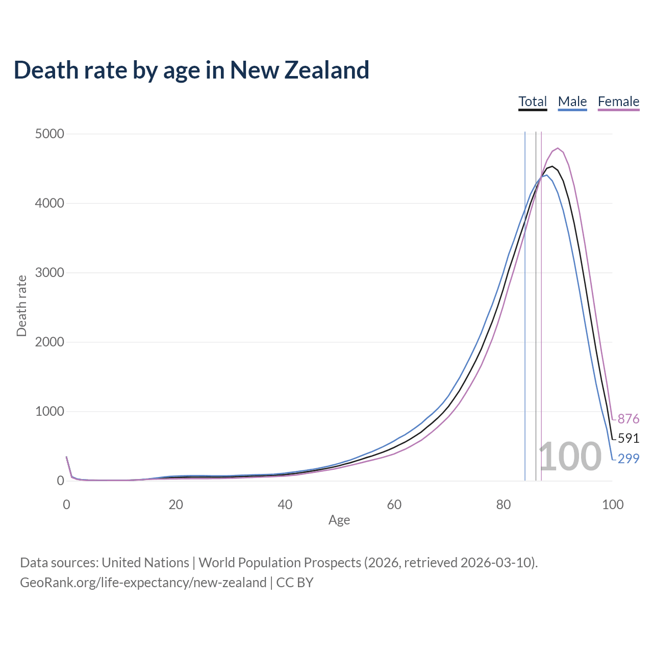 This life expectancy calculator shows the odds of living to 100, 95, 90, and below based on current age for both males and females in New Zealand, along with mean and median age of death. The calculations are based on the 2026 life tables (actuarial tables) from the UN World Population Prospects.