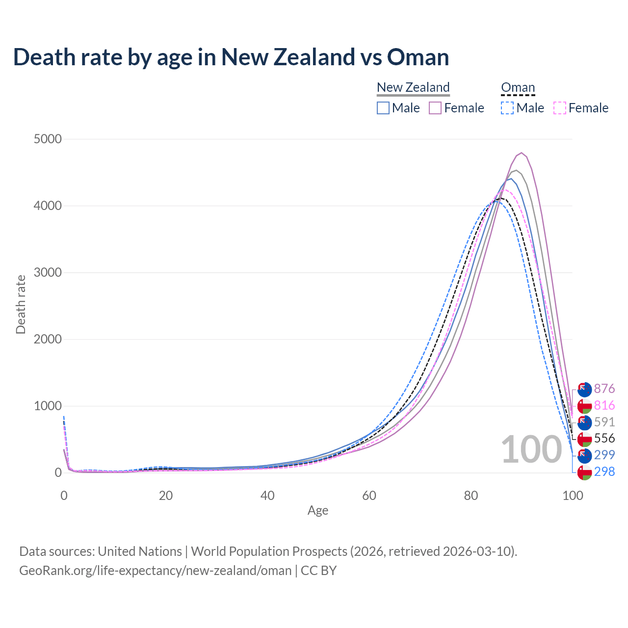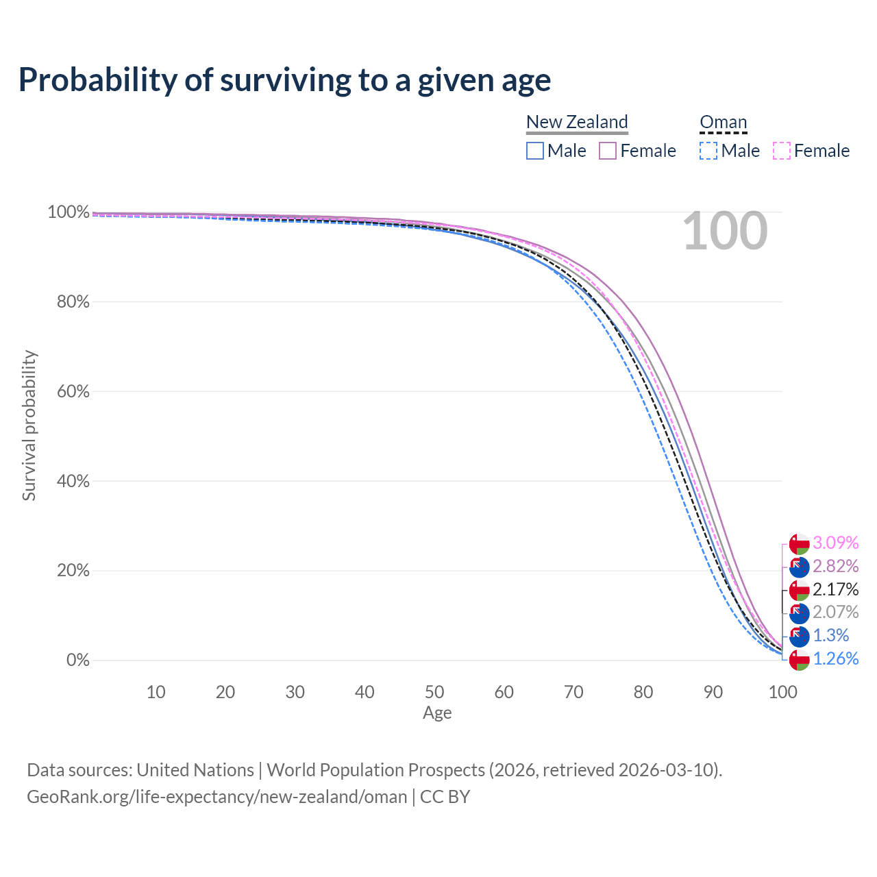 This life expectancy calculator shows the odds of living to 100, 95, 90, and below based on current age for both males and females in New Zealand and Oman, along with mean and median age of death. The calculations are based on the 2026 life tables (actuarial tables) from the UN World Population Prospects.