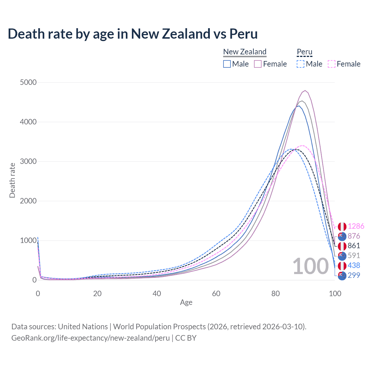 In New Zealand, the most common age of death is 89, compared to 87 in Peru. The median age of death is 85.8 in New Zealand and 82.4 in Peru, meaning only half of each cohort is expected to live past that age.