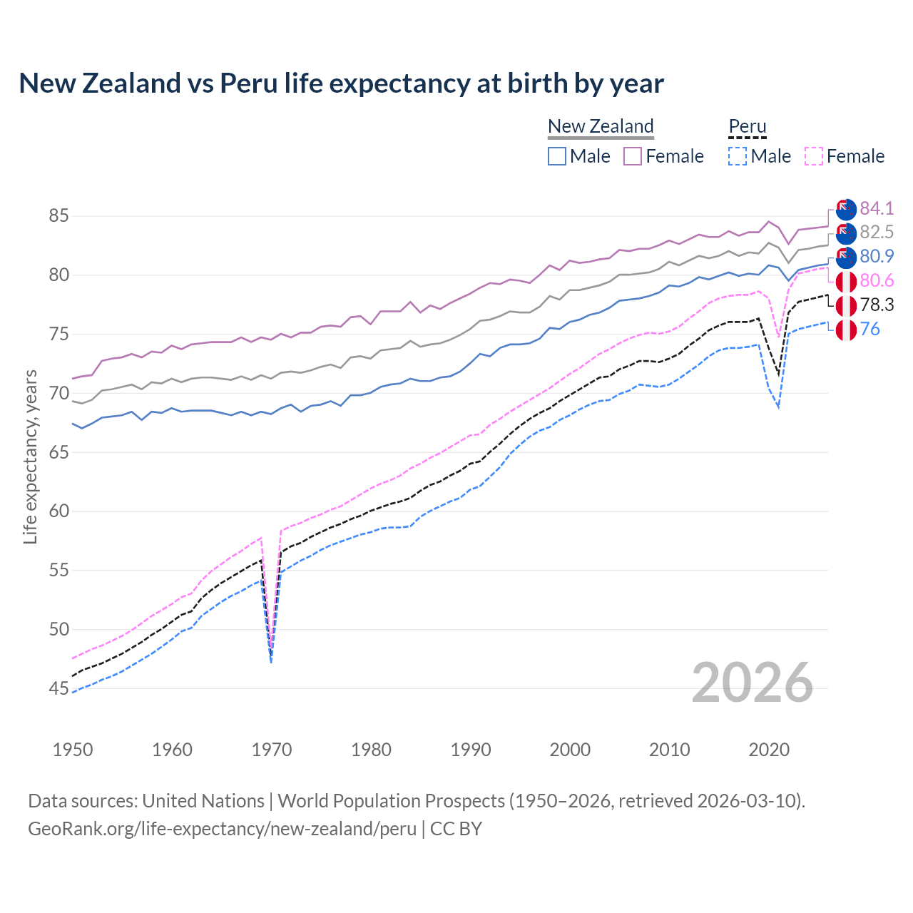 The average life expectancy at birth is 82.5 years in New Zealand vs 78.3 in Peru. New Zealand is ranked 27/197 by life expectancy, and Peru is 59/197. In New Zealand, the life expectancy is 80.9 years for males and 84.1 years for females. In Peru, it's 76 years for males and 80.6 years for females.