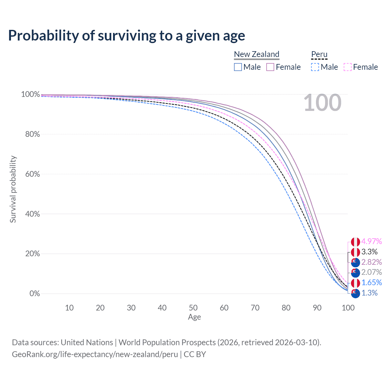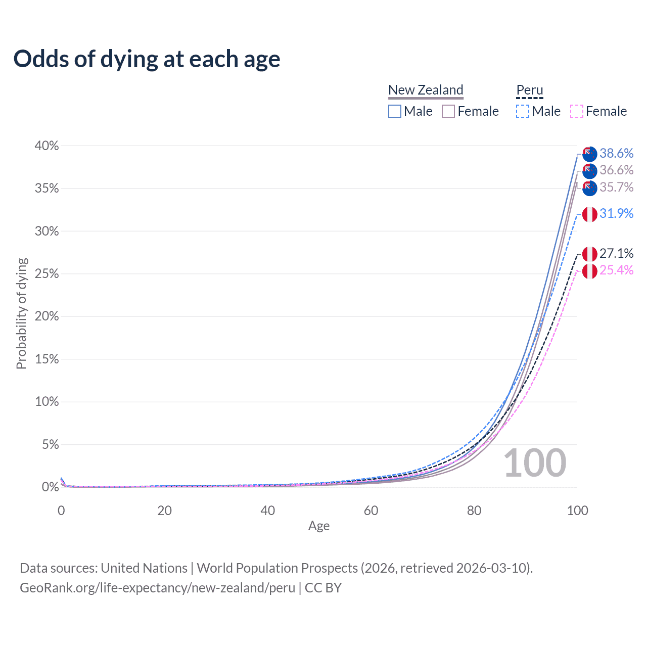 This life expectancy calculator shows the odds of living to 100, 95, 90, and below based on current age for both males and females in New Zealand and Peru, along with mean and median age of death. The calculations are based on the 2026 life tables (actuarial tables) from the UN World Population Prospects.