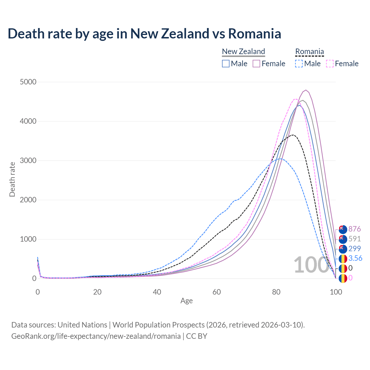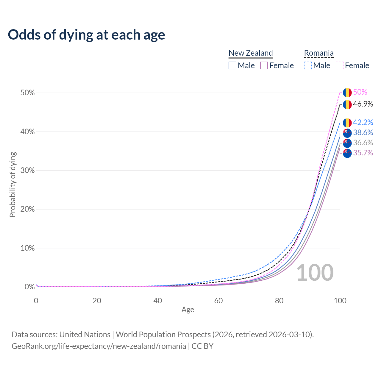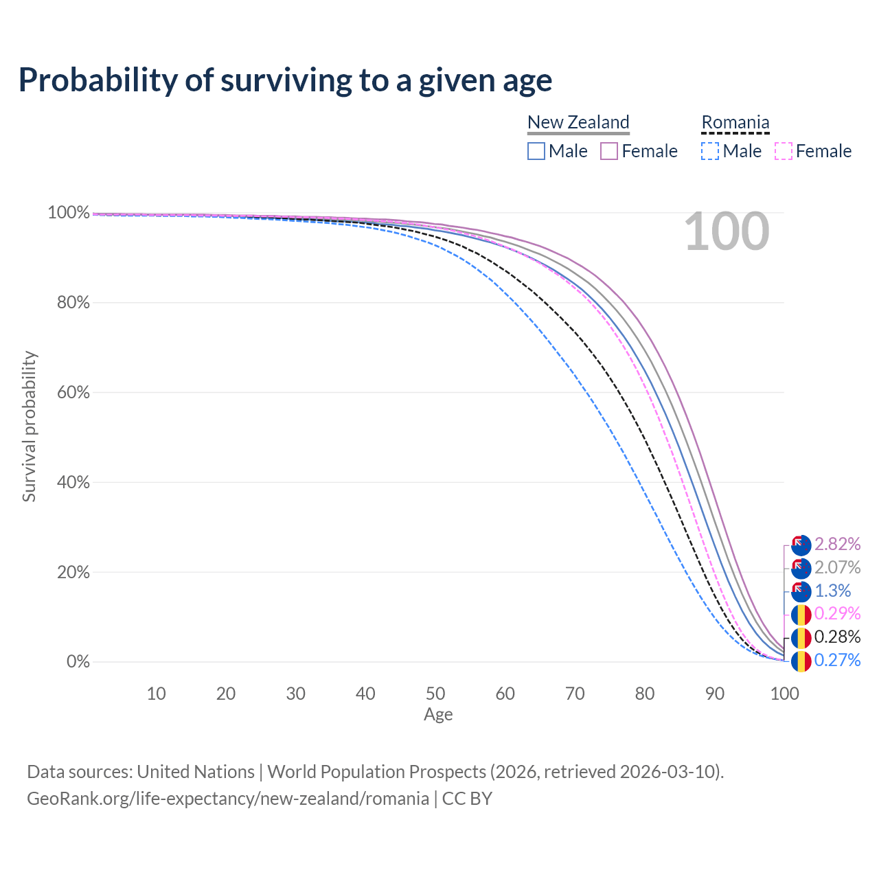 This life expectancy calculator shows the odds of living to 100, 95, 90, and below based on current age for both males and females in New Zealand and Romania, along with mean and median age of death. The calculations are based on the 2026 life tables (actuarial tables) from the UN World Population Prospects.
