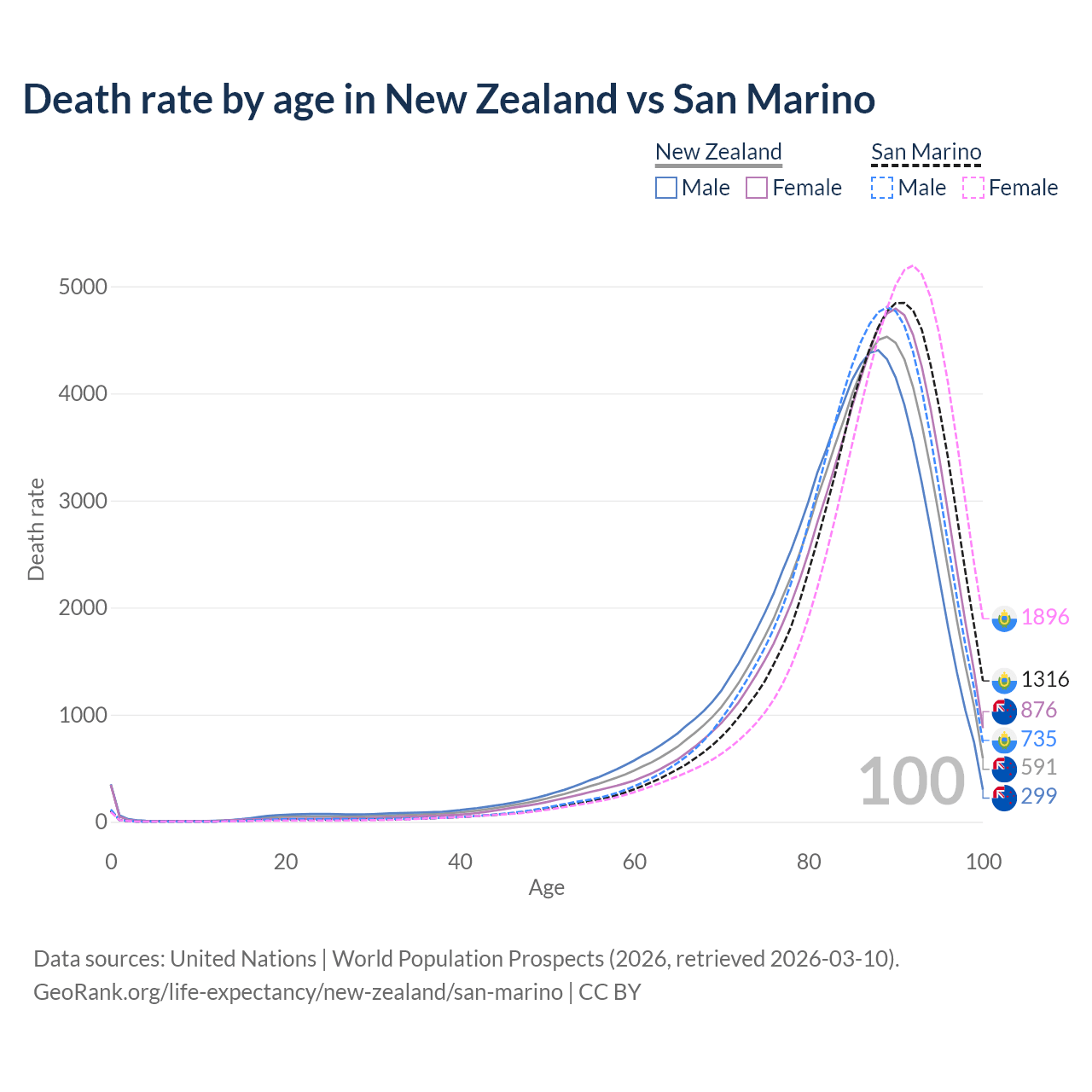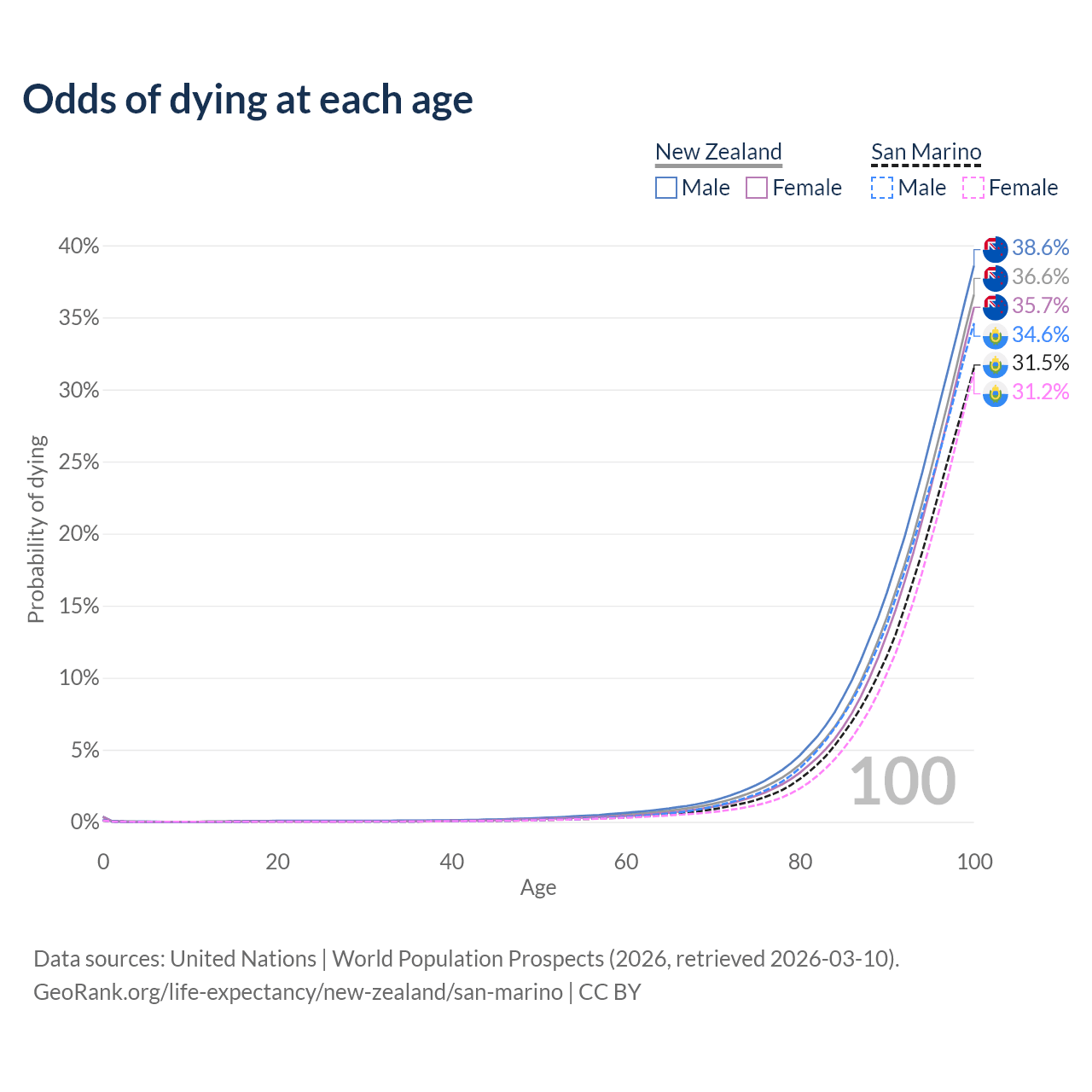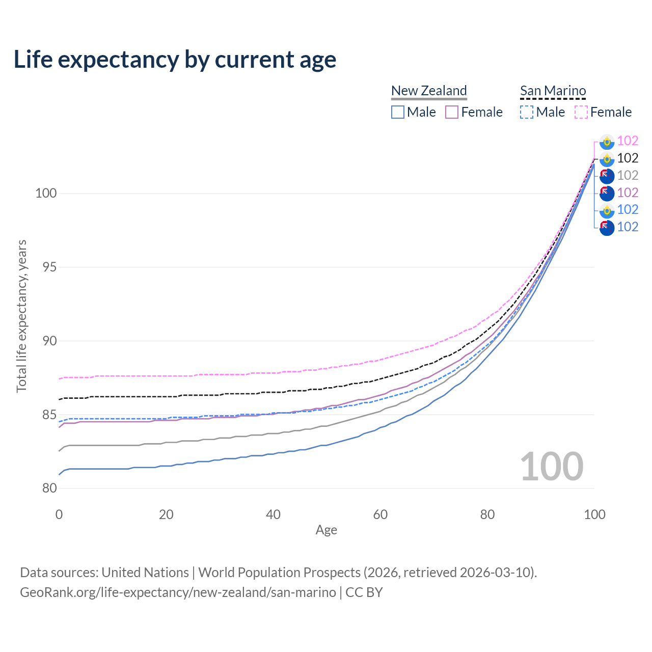 This life expectancy calculator shows the odds of living to 100, 95, 90, and below based on current age for both males and females in New Zealand and San Marino, along with mean and median age of death. The calculations are based on the 2026 life tables (actuarial tables) from the UN World Population Prospects.