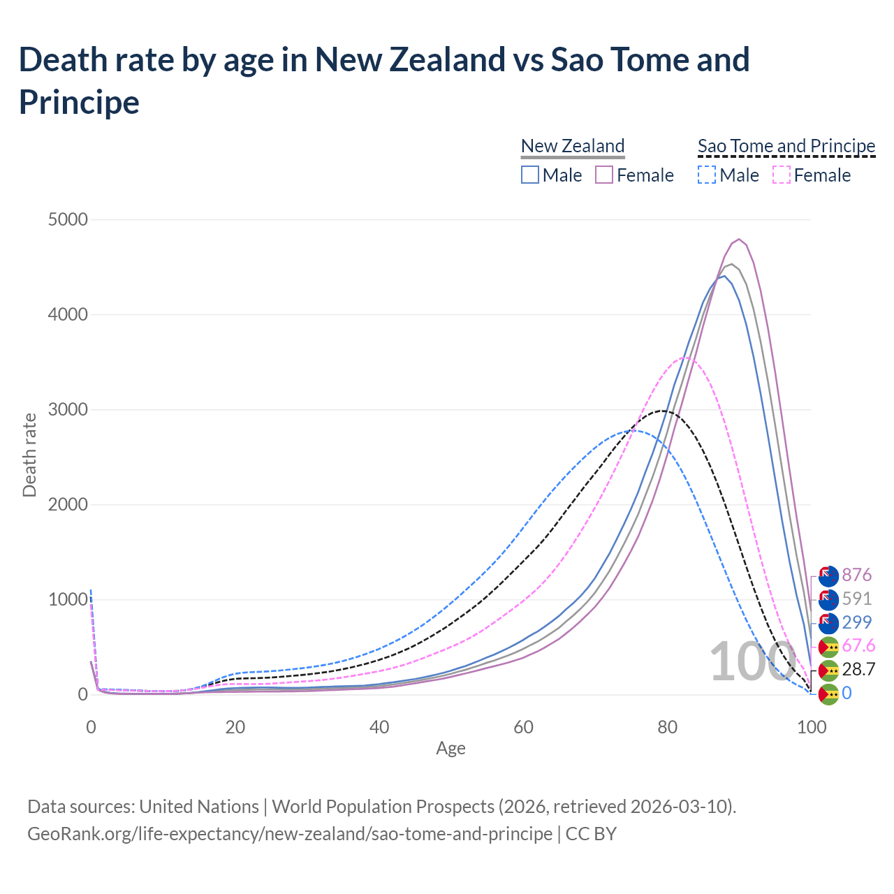 In New Zealand, the most common age of death is 89, compared to 79 in Sao Tome and Principe. The median age of death is 85.8 in New Zealand and 74.1 in Sao Tome and Principe, meaning only half of each cohort is expected to live past that age.