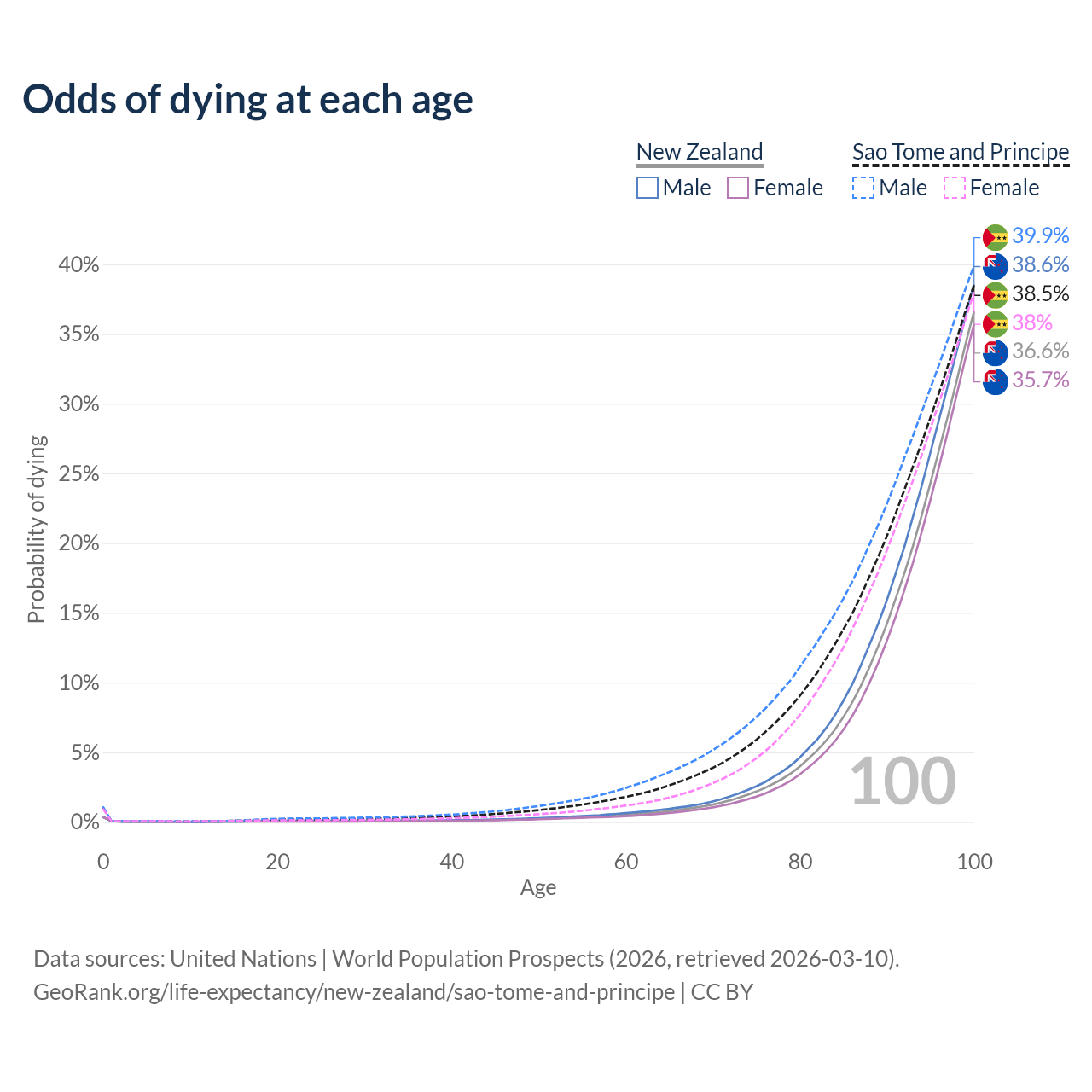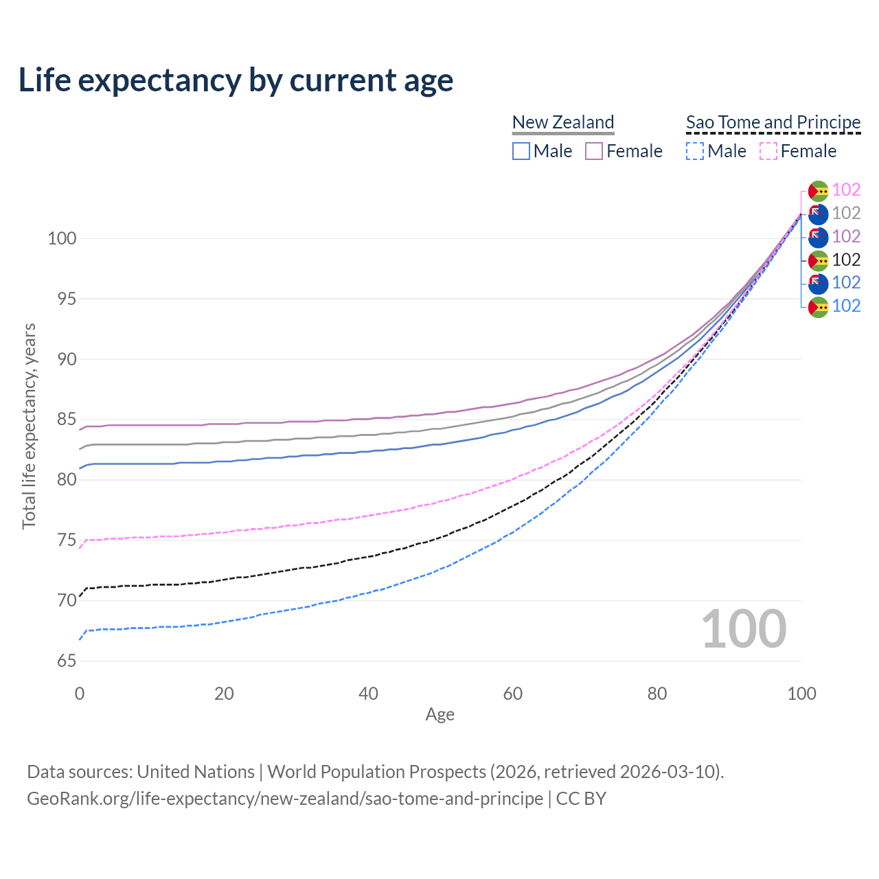 This life expectancy calculator shows the odds of living to 100, 95, 90, and below based on current age for both males and females in New Zealand and Sao Tome and Principe, along with mean and median age of death. The calculations are based on the 2026 life tables (actuarial tables) from the UN World Population Prospects.