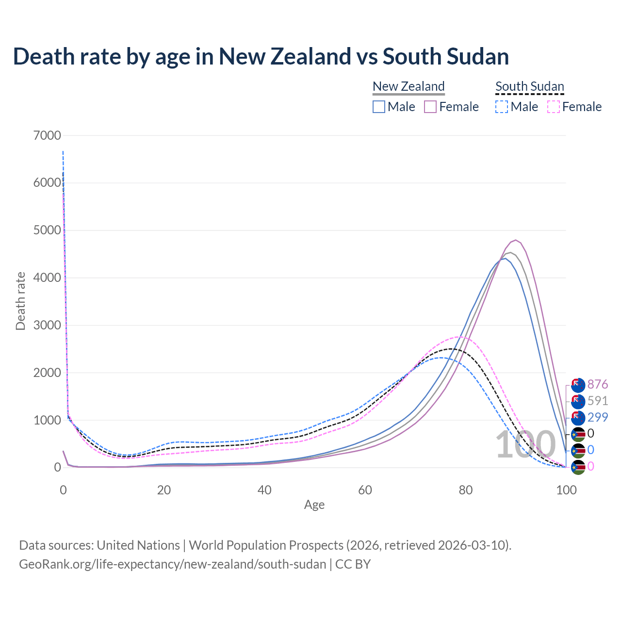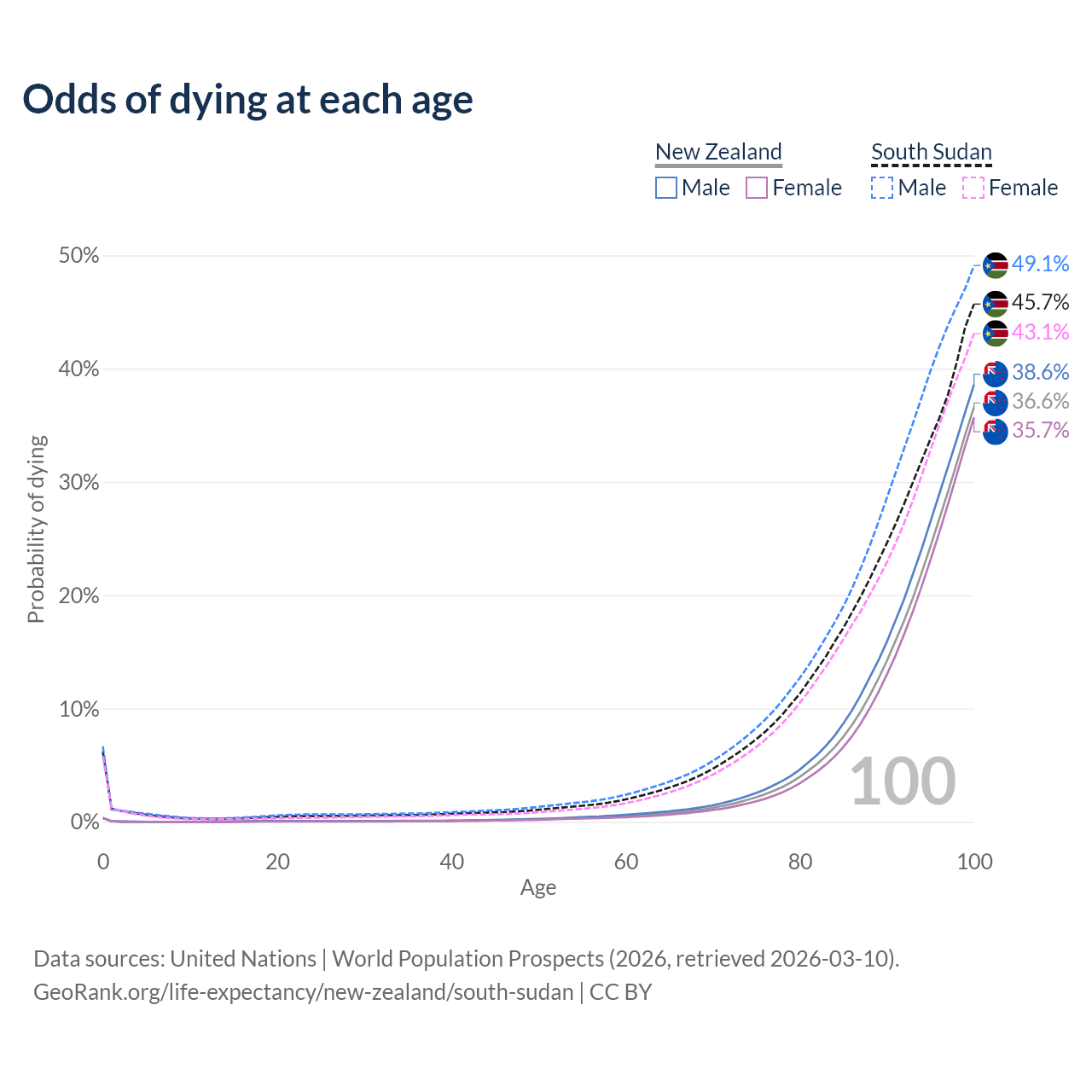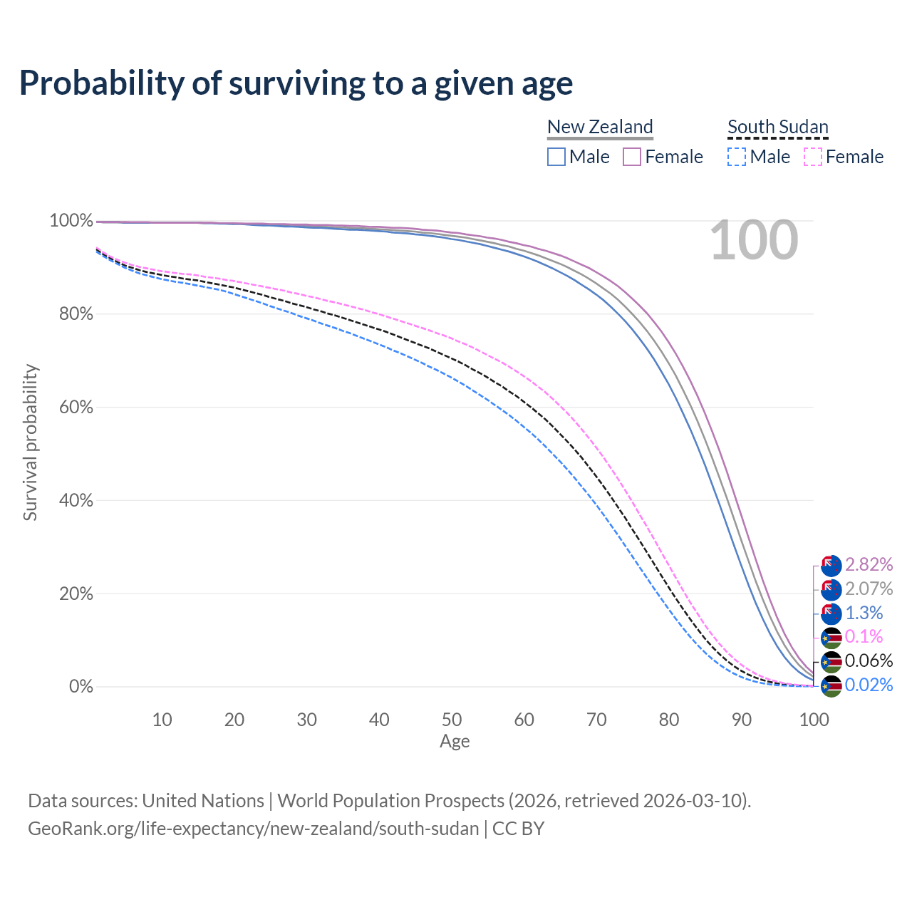 This life expectancy calculator shows the odds of living to 100, 95, 90, and below based on current age for both males and females in New Zealand and South Sudan, along with mean and median age of death. The calculations are based on the 2026 life tables (actuarial tables) from the UN World Population Prospects.