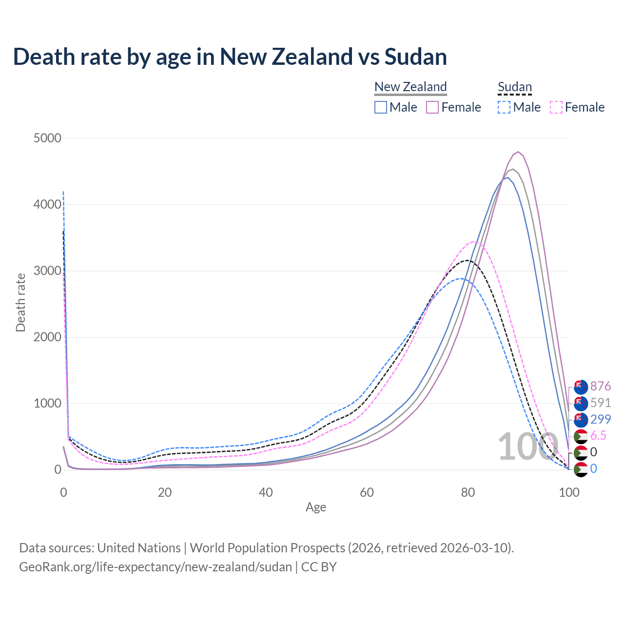 In New Zealand, the most common age of death is 89, compared to 0 in Sudan. The median age of death is 85.8 in New Zealand and 74.1 in Sudan, meaning only half of each cohort is expected to live past that age.