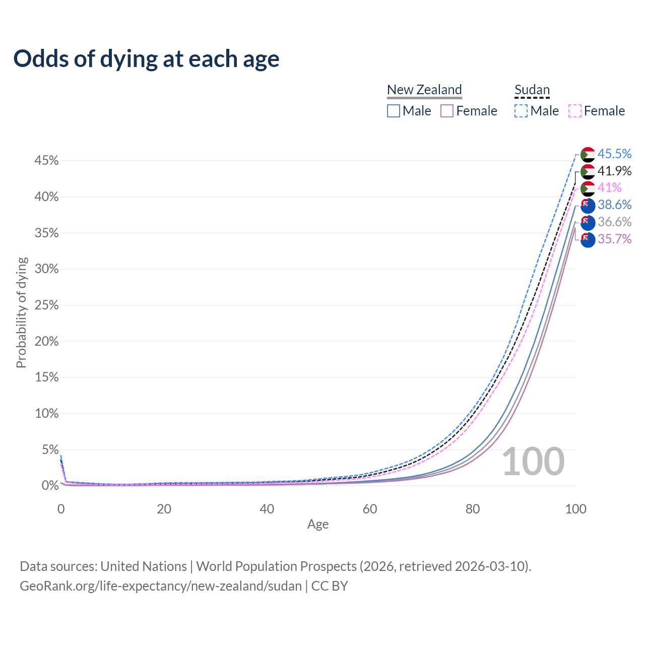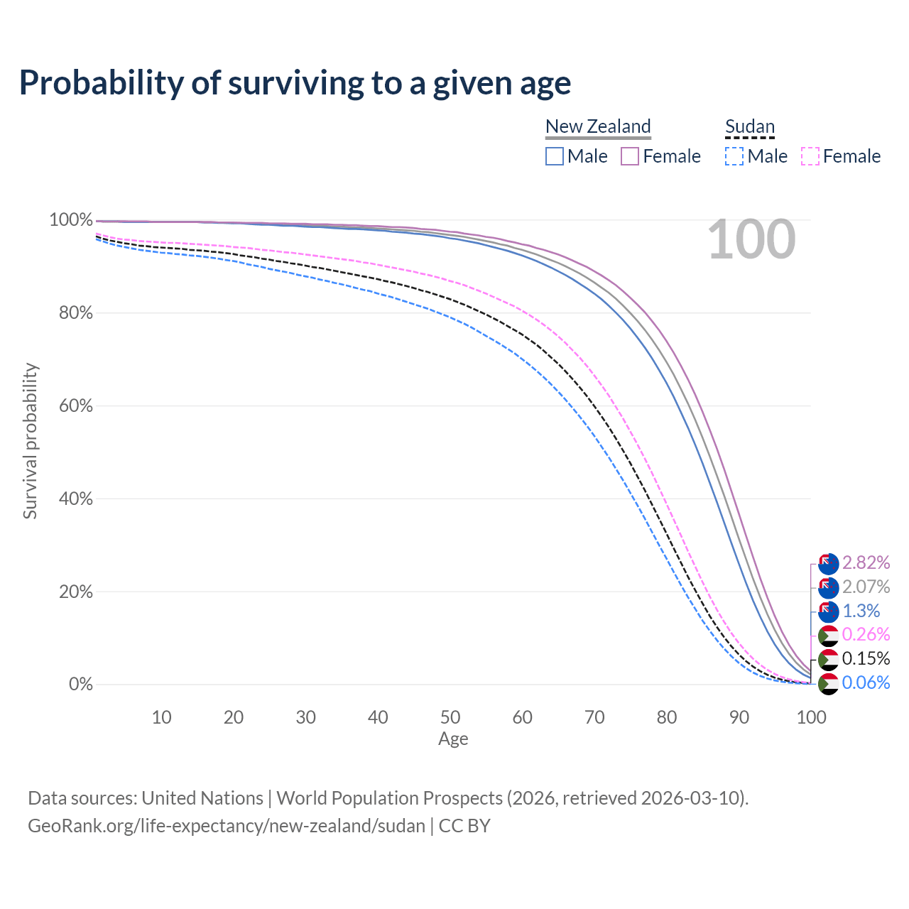 This life expectancy calculator shows the odds of living to 100, 95, 90, and below based on current age for both males and females in New Zealand and Sudan, along with mean and median age of death. The calculations are based on the 2026 life tables (actuarial tables) from the UN World Population Prospects.