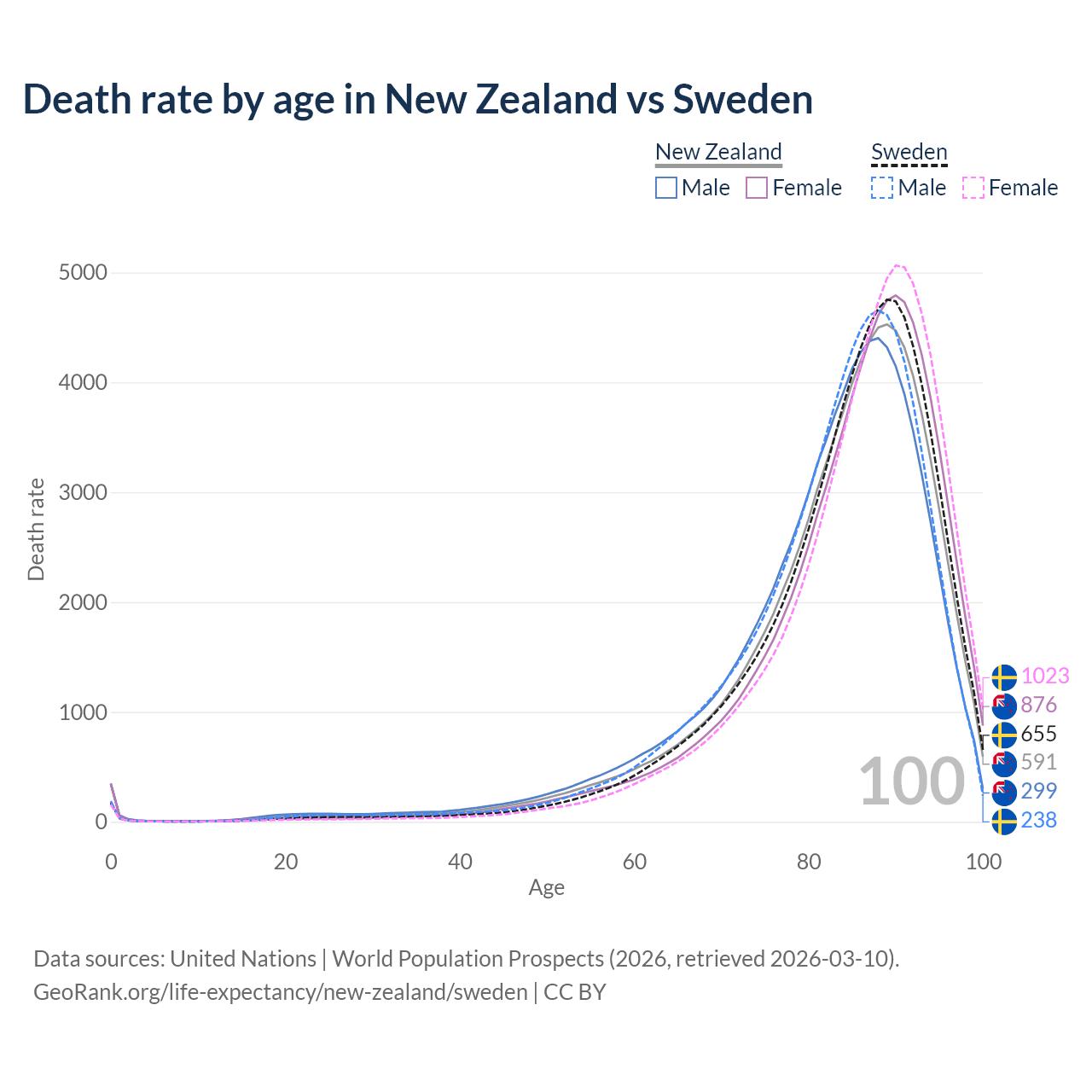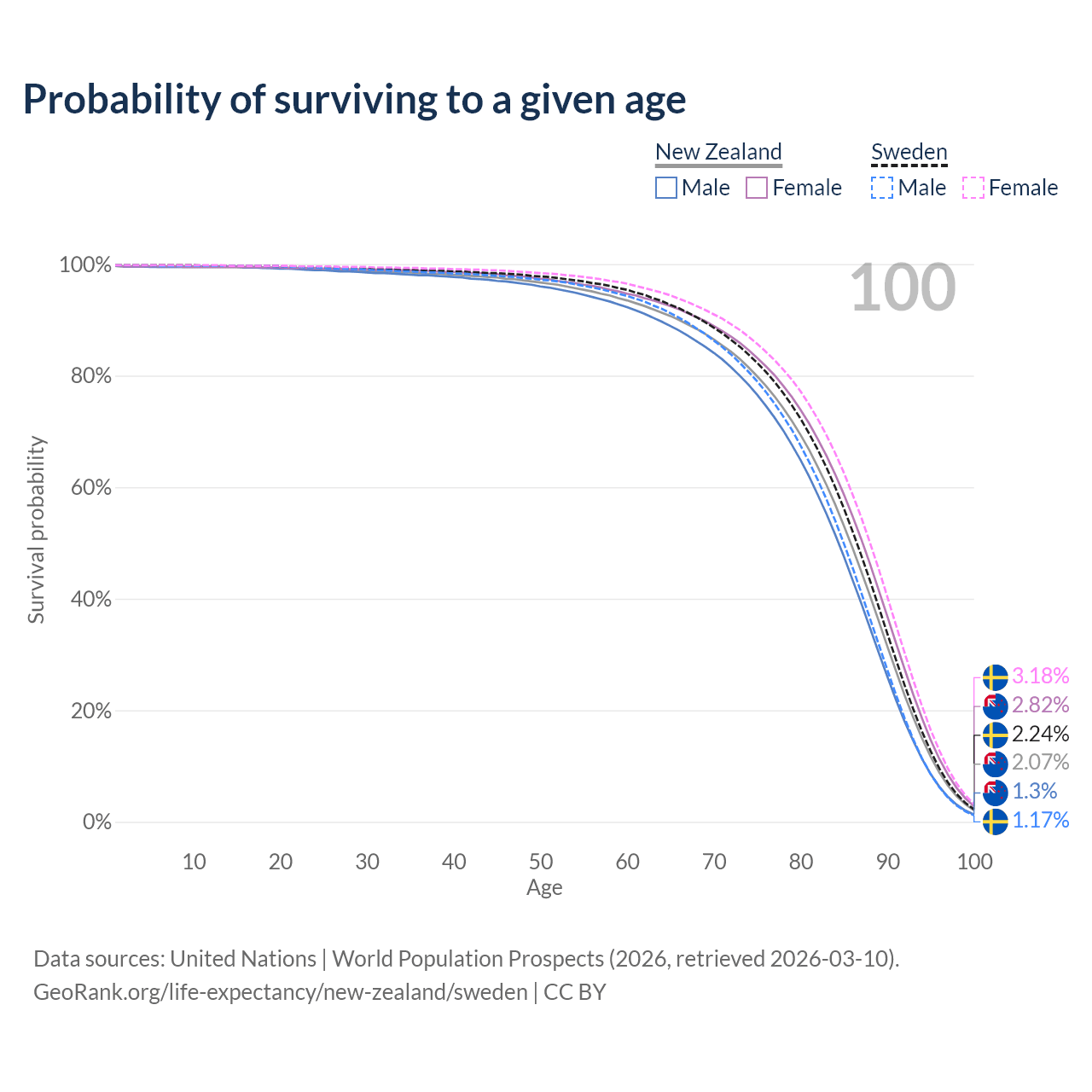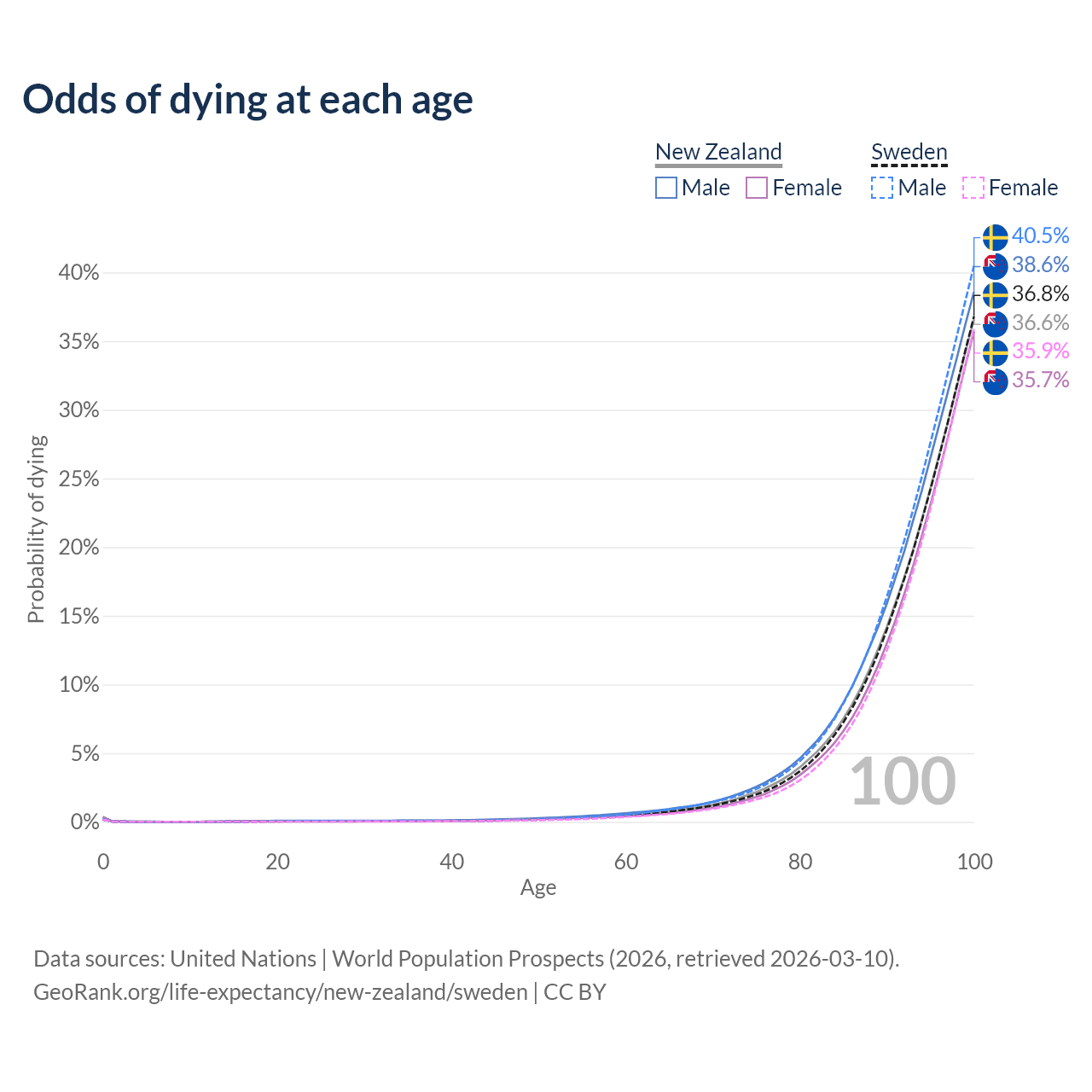 This life expectancy calculator shows the odds of living to 100, 95, 90, and below based on current age for both males and females in New Zealand and Sweden, along with mean and median age of death. The calculations are based on the 2026 life tables (actuarial tables) from the UN World Population Prospects.