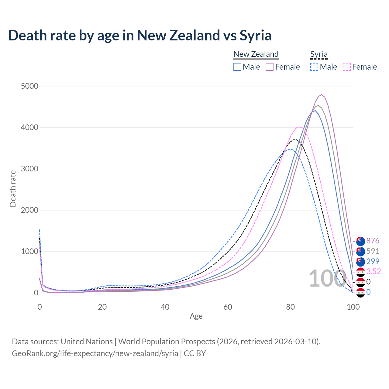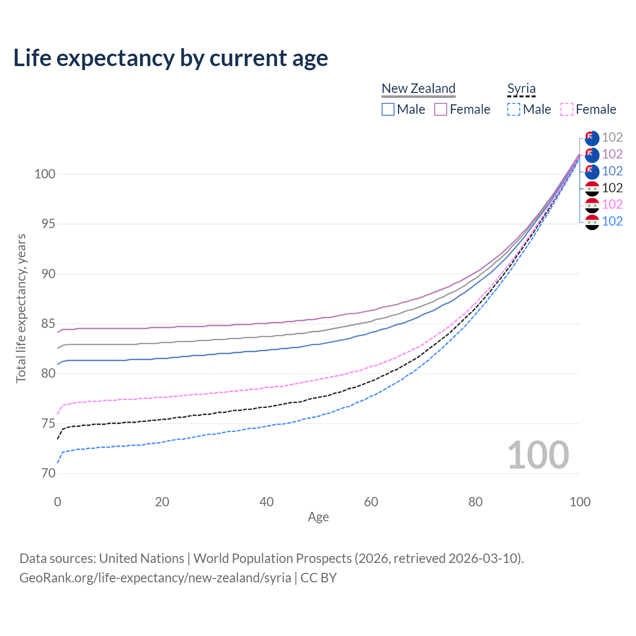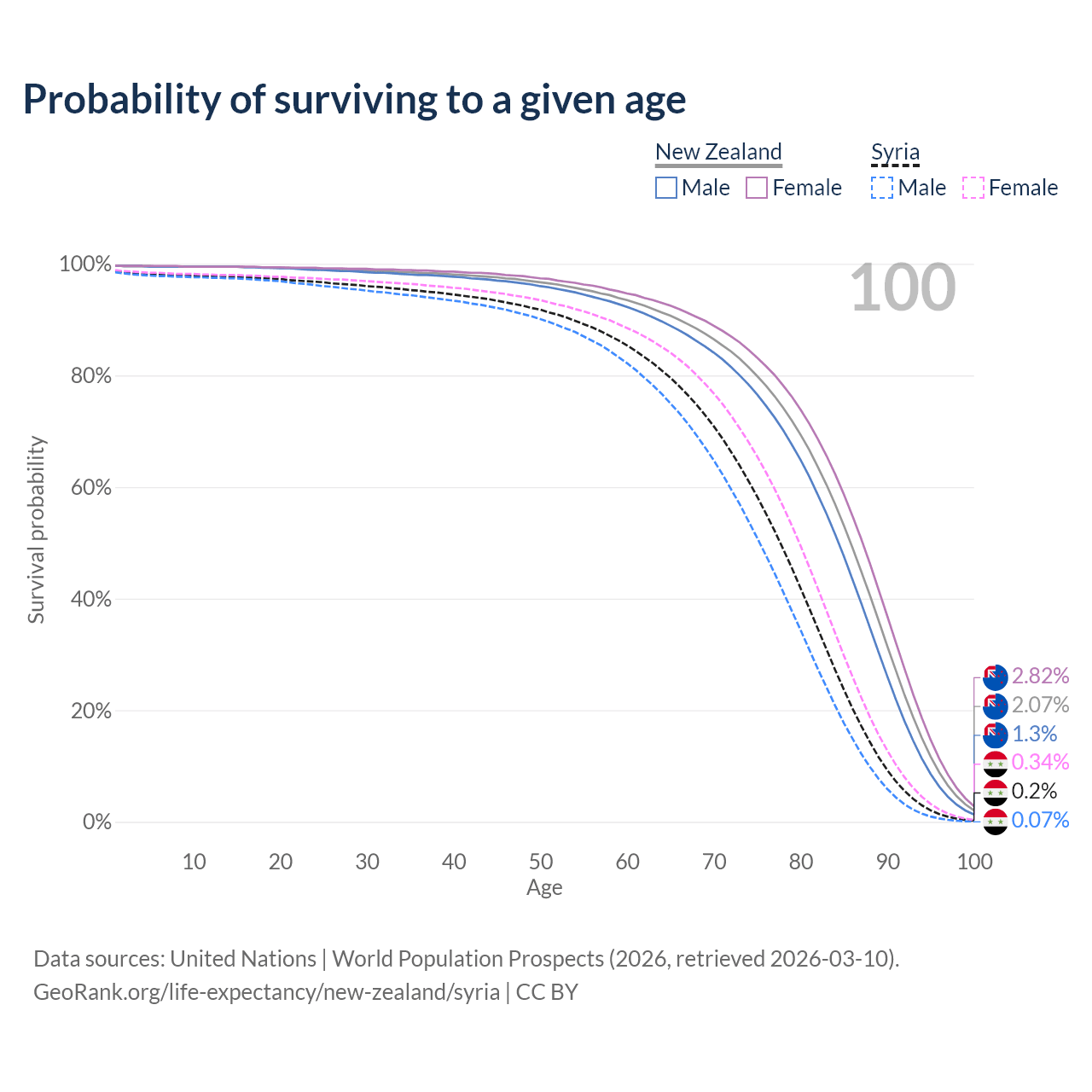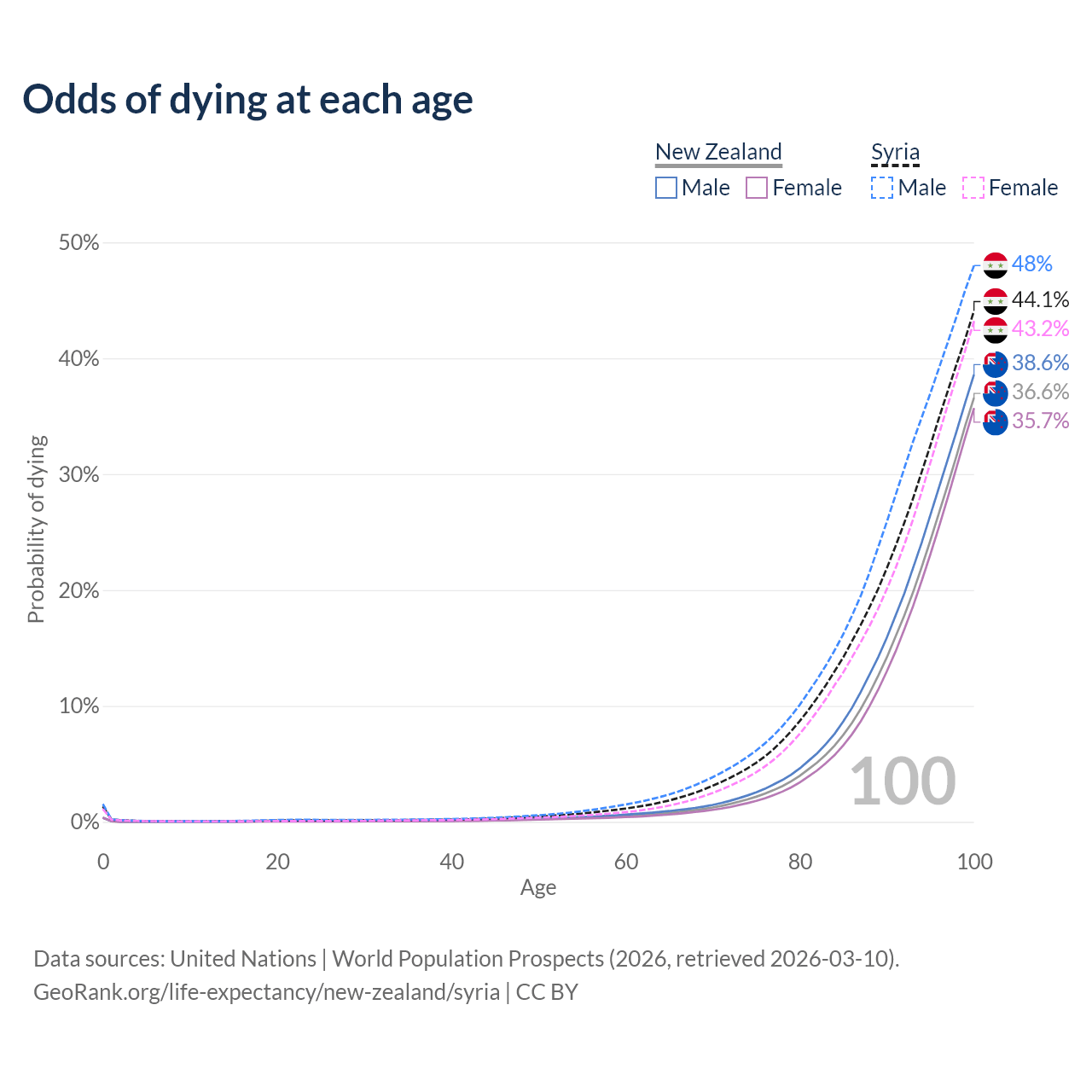 This life expectancy calculator shows the odds of living to 100, 95, 90, and below based on current age for both males and females in New Zealand and Syria, along with mean and median age of death. The calculations are based on the 2026 life tables (actuarial tables) from the UN World Population Prospects.