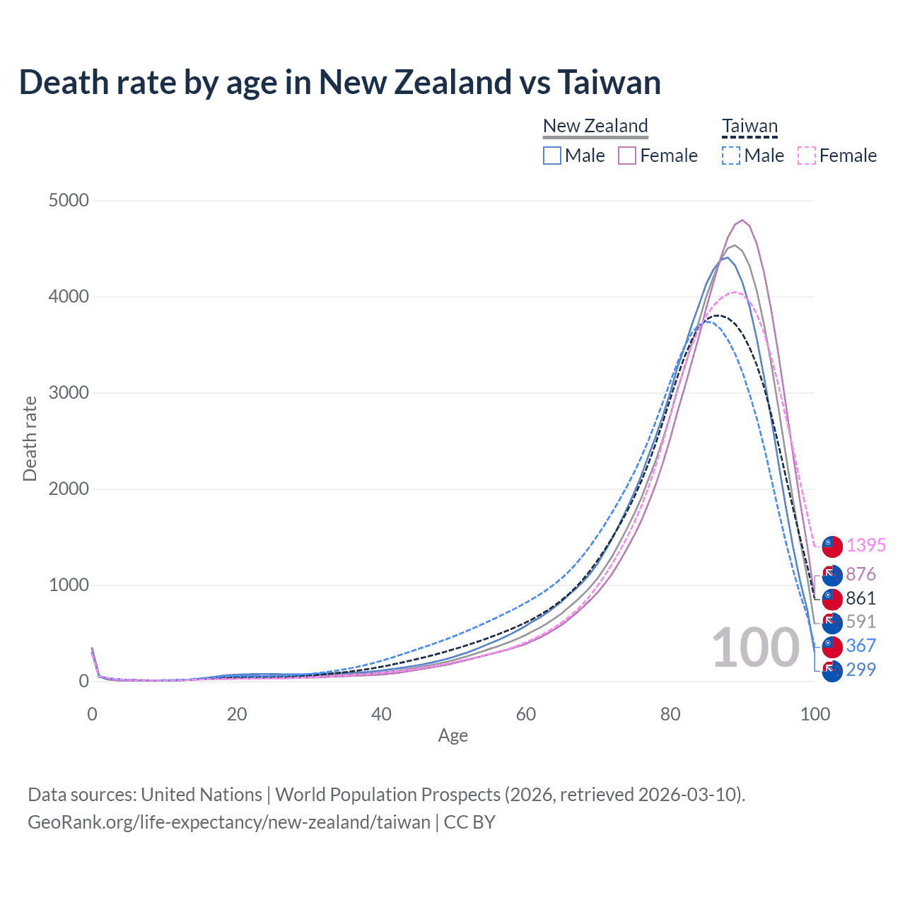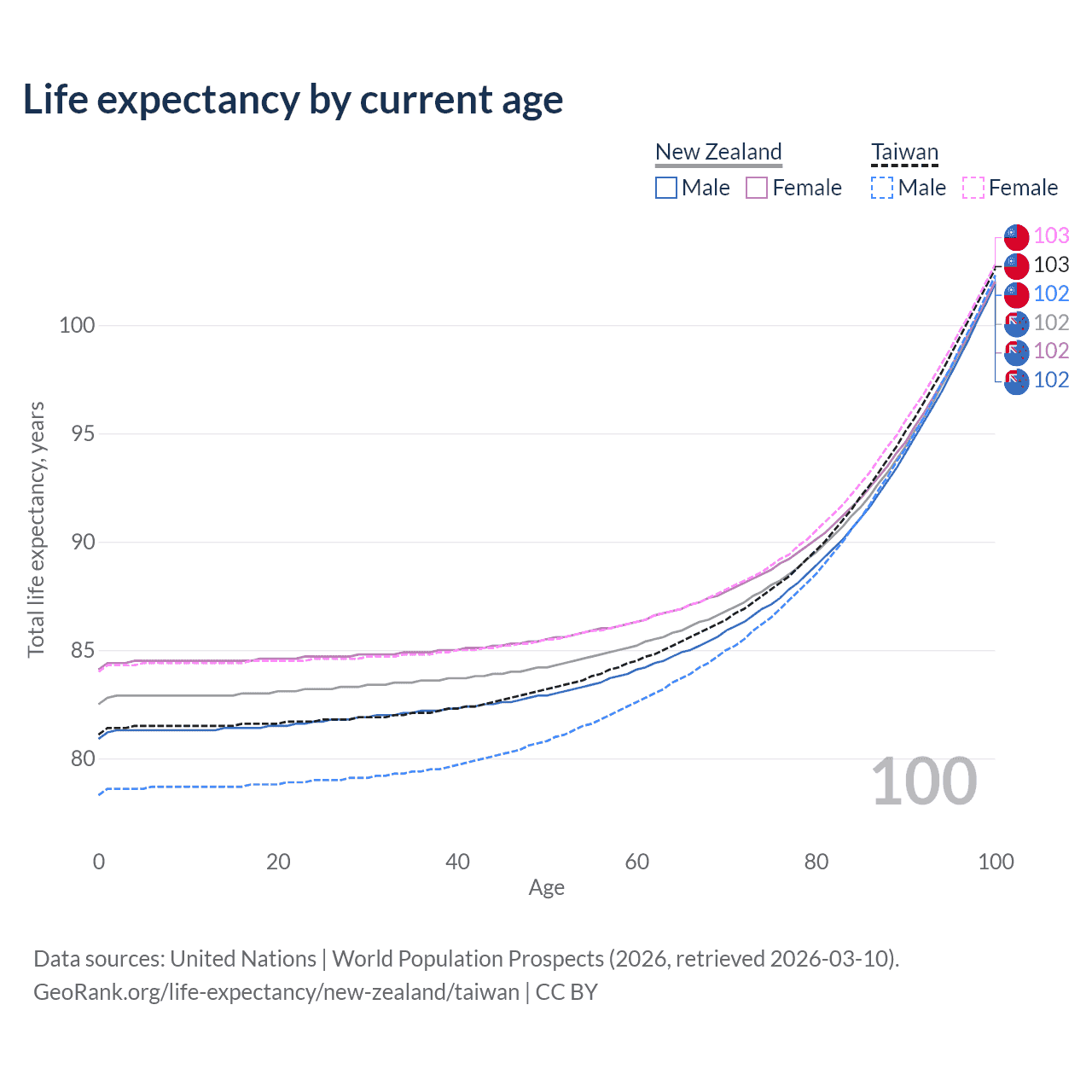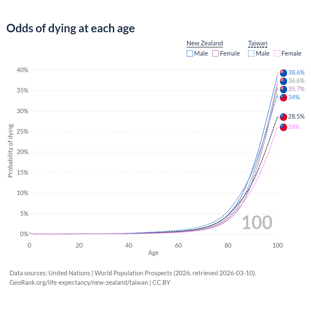 This life expectancy calculator shows the odds of living to 100, 95, 90, and below based on current age for both males and females in New Zealand and Taiwan, along with mean and median age of death. The calculations are based on the 2026 life tables (actuarial tables) from the UN World Population Prospects.