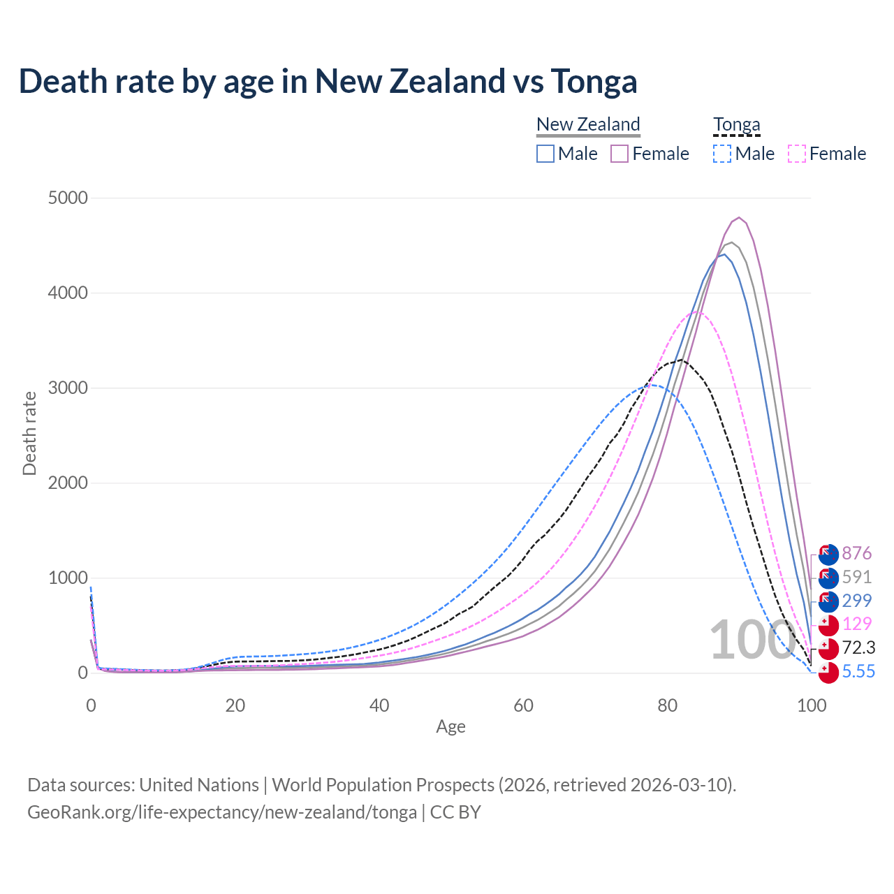 In New Zealand, the most common age of death is 89, compared to 82 in Tonga. The median age of death is 85.8 in New Zealand and 77 in Tonga, meaning only half of each cohort is expected to live past that age.