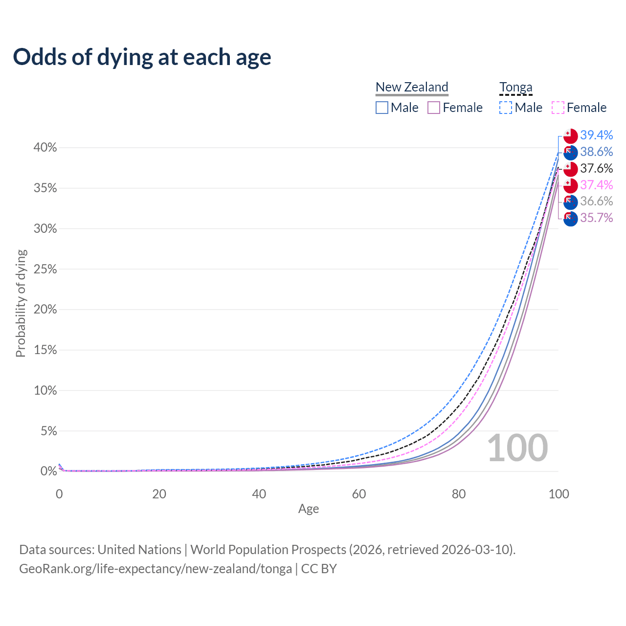 This life expectancy calculator shows the odds of living to 100, 95, 90, and below based on current age for both males and females in New Zealand and Tonga, along with mean and median age of death. The calculations are based on the 2026 life tables (actuarial tables) from the UN World Population Prospects.