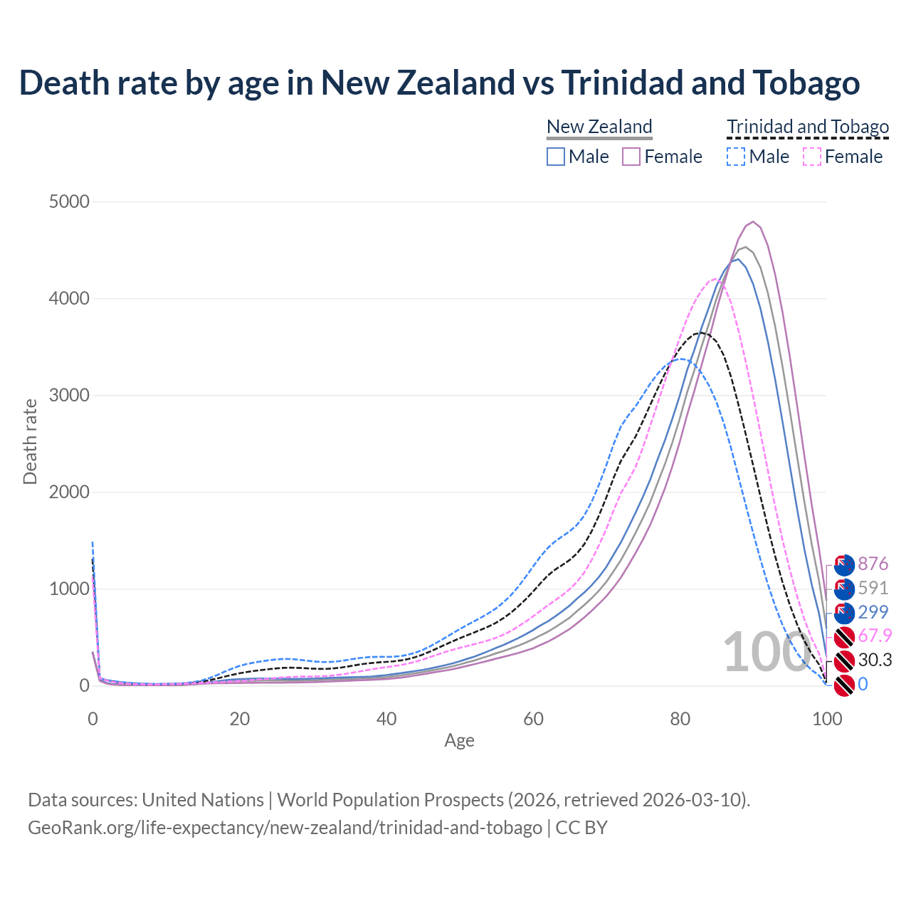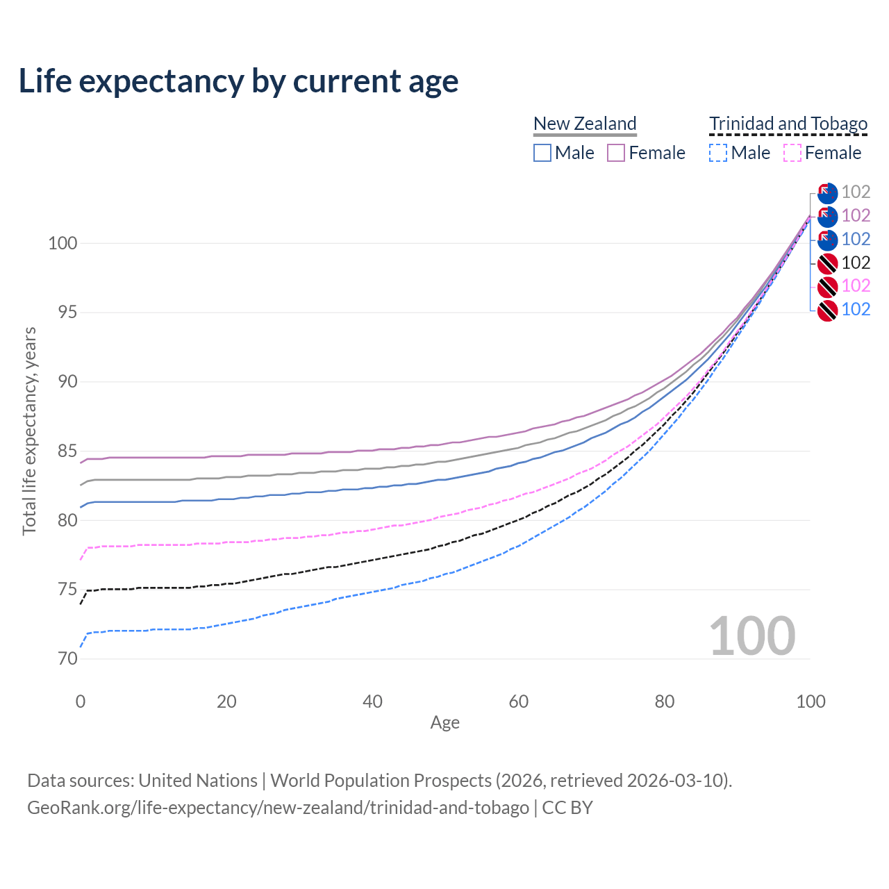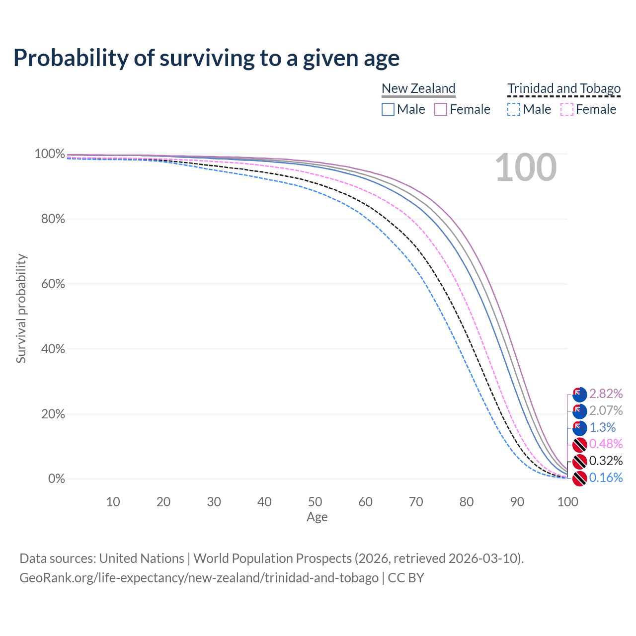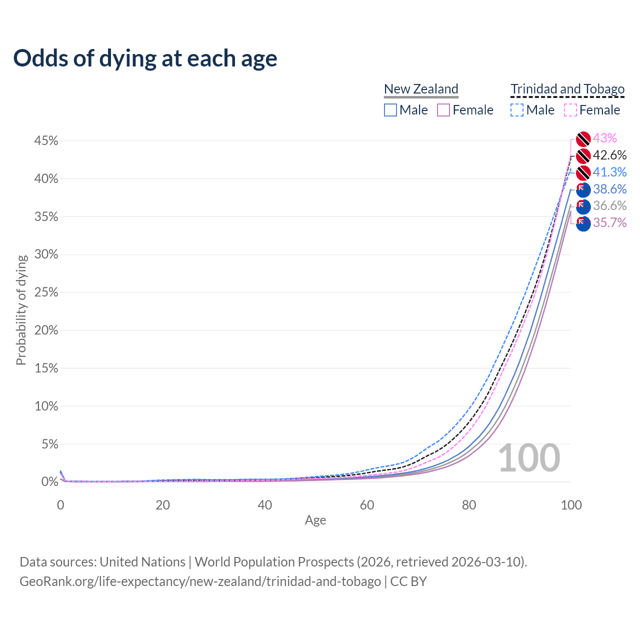 This life expectancy calculator shows the odds of living to 100, 95, 90, and below based on current age for both males and females in New Zealand and Trinidad and Tobago, along with mean and median age of death. The calculations are based on the 2026 life tables (actuarial tables) from the UN World Population Prospects.