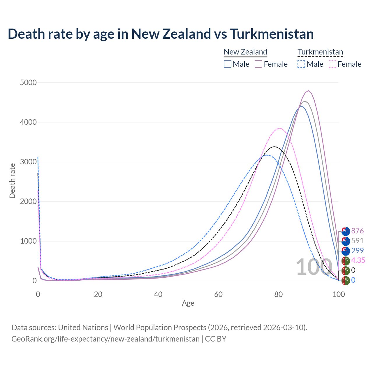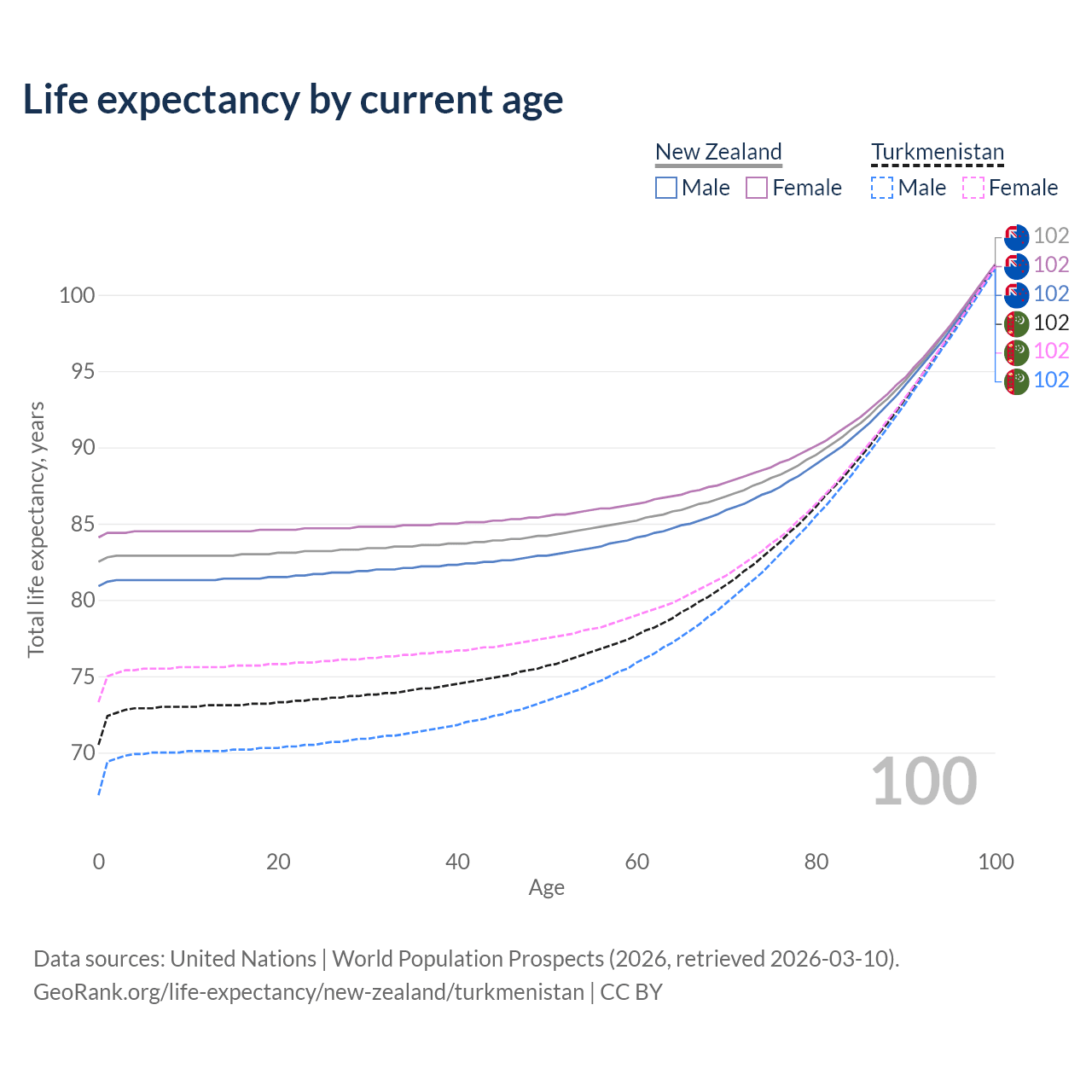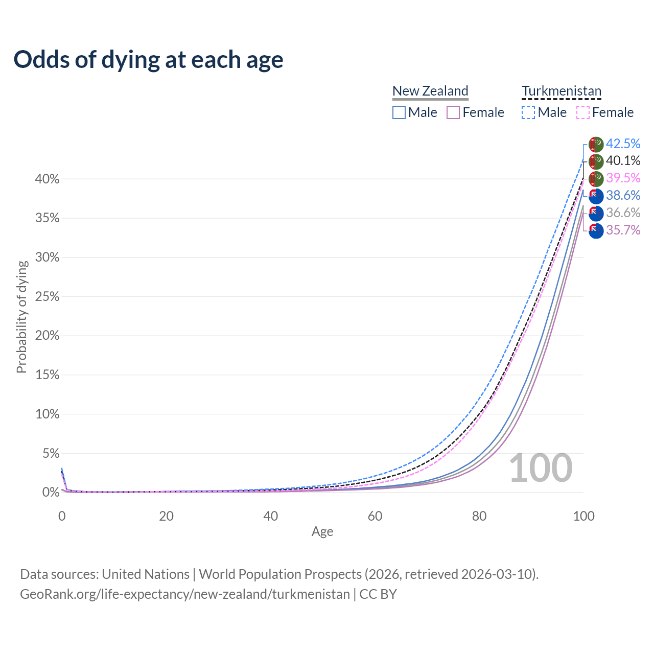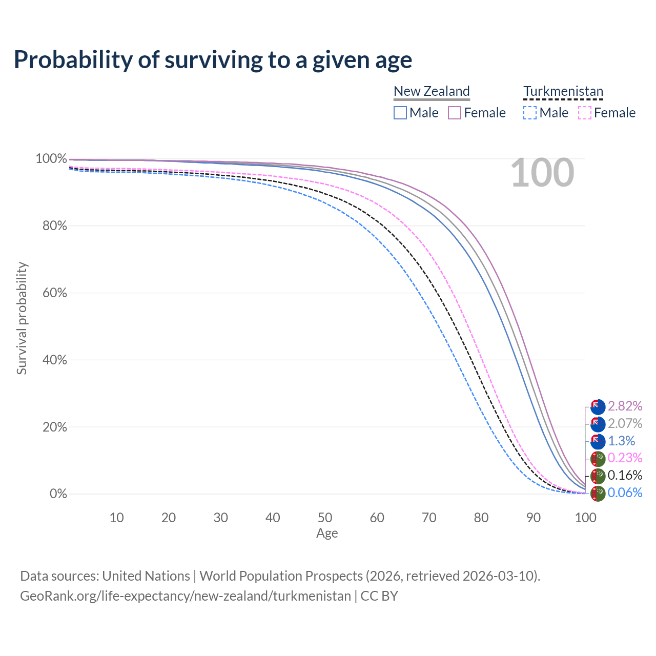 This life expectancy calculator shows the odds of living to 100, 95, 90, and below based on current age for both males and females in New Zealand and Turkmenistan, along with mean and median age of death. The calculations are based on the 2026 life tables (actuarial tables) from the UN World Population Prospects.