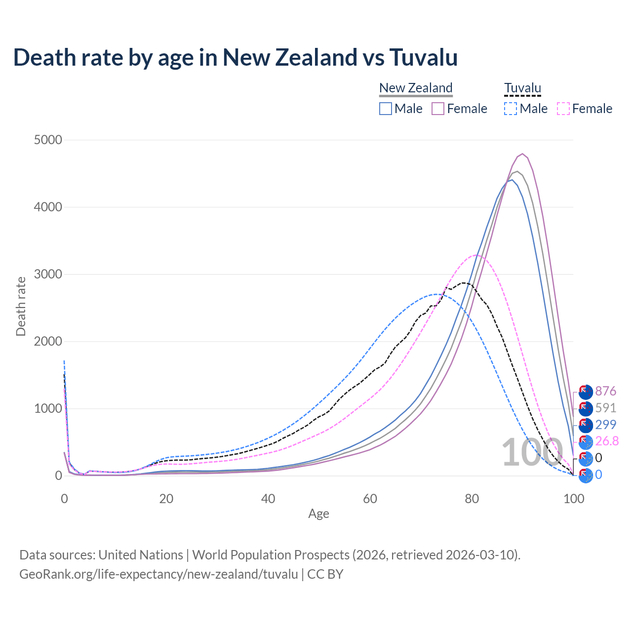 In New Zealand, the most common age of death is 89, compared to 78 in Tuvalu. The median age of death is 85.8 in New Zealand and 71.9 in Tuvalu, meaning only half of each cohort is expected to live past that age.