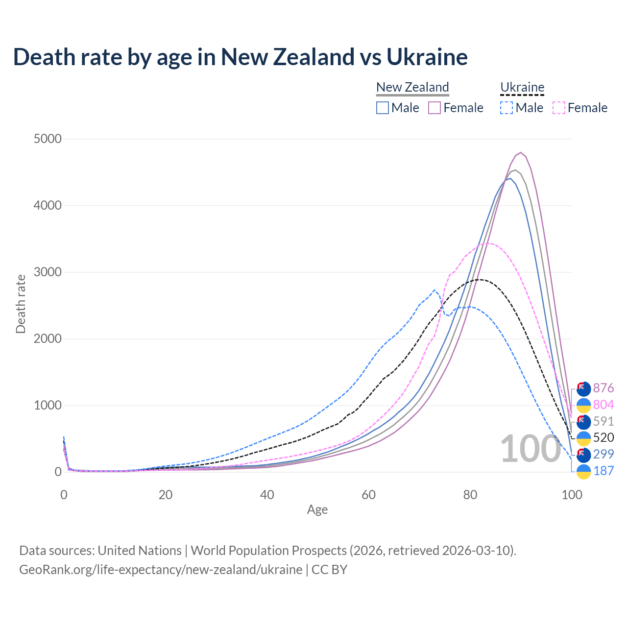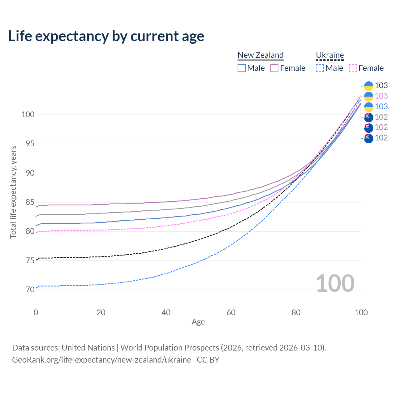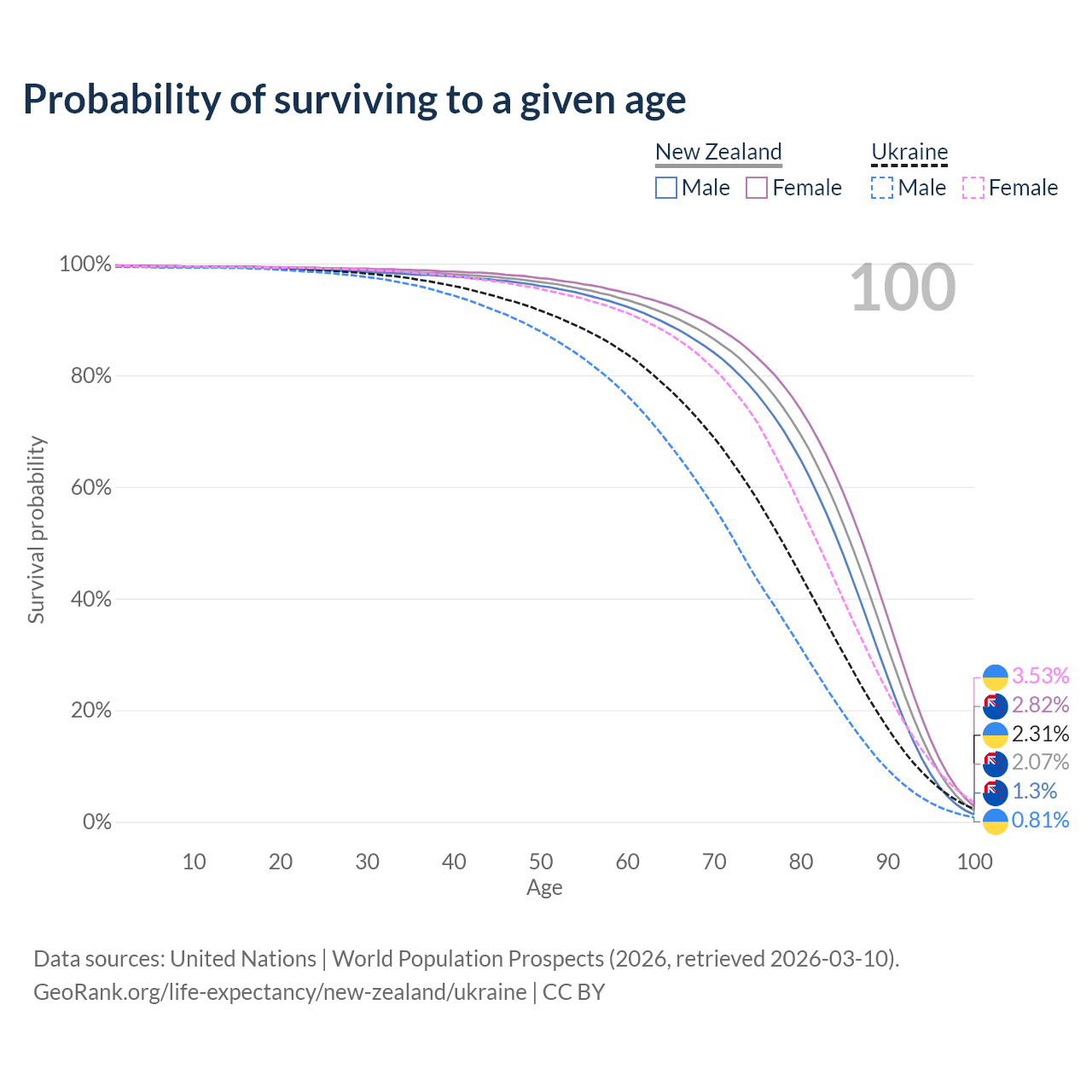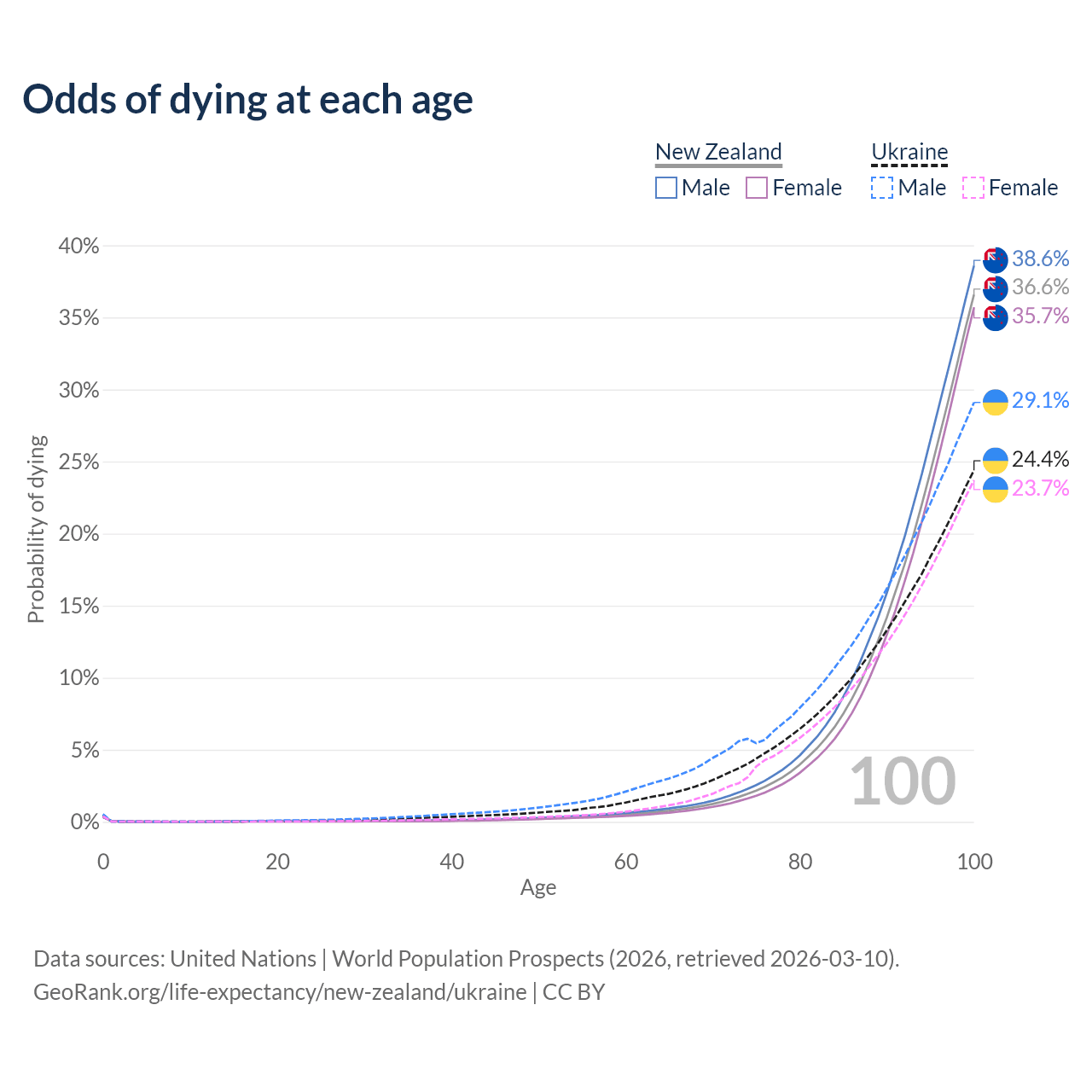 This life expectancy calculator shows the odds of living to 100, 95, 90, and below based on current age for both males and females in New Zealand and Ukraine, along with mean and median age of death. The calculations are based on the 2026 life tables (actuarial tables) from the UN World Population Prospects.