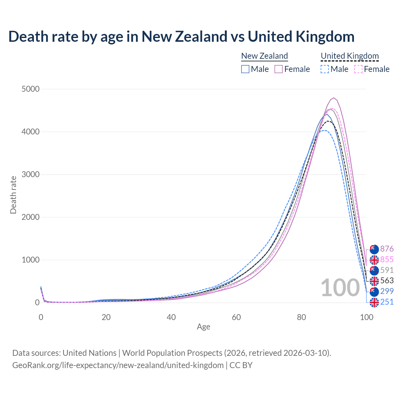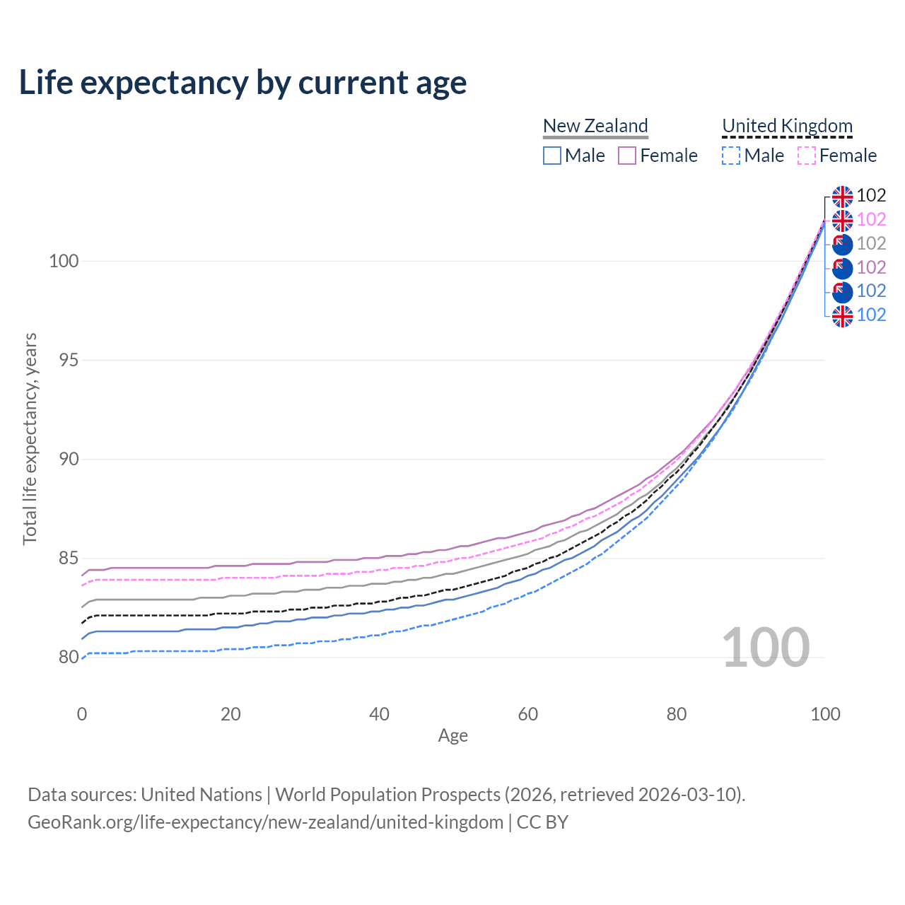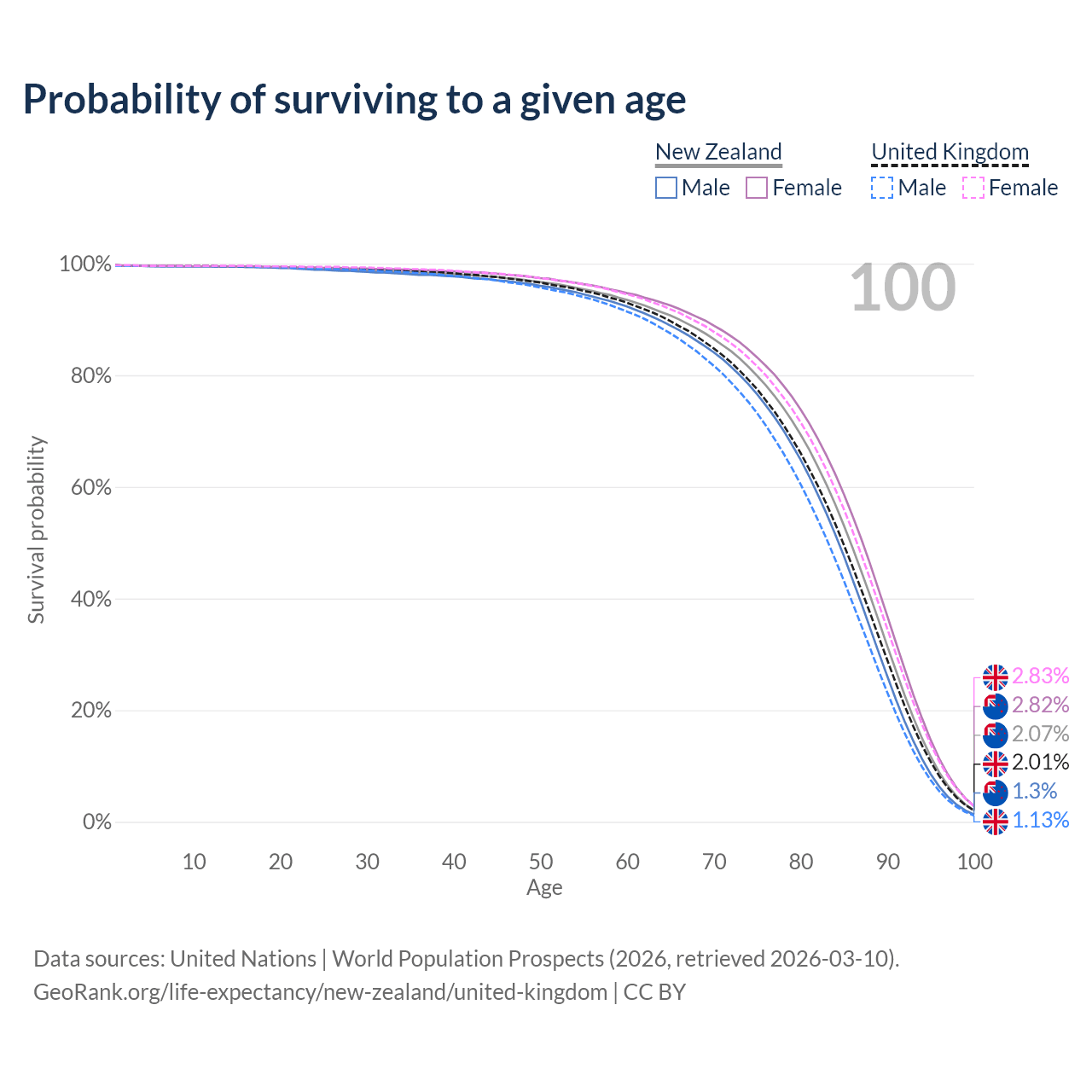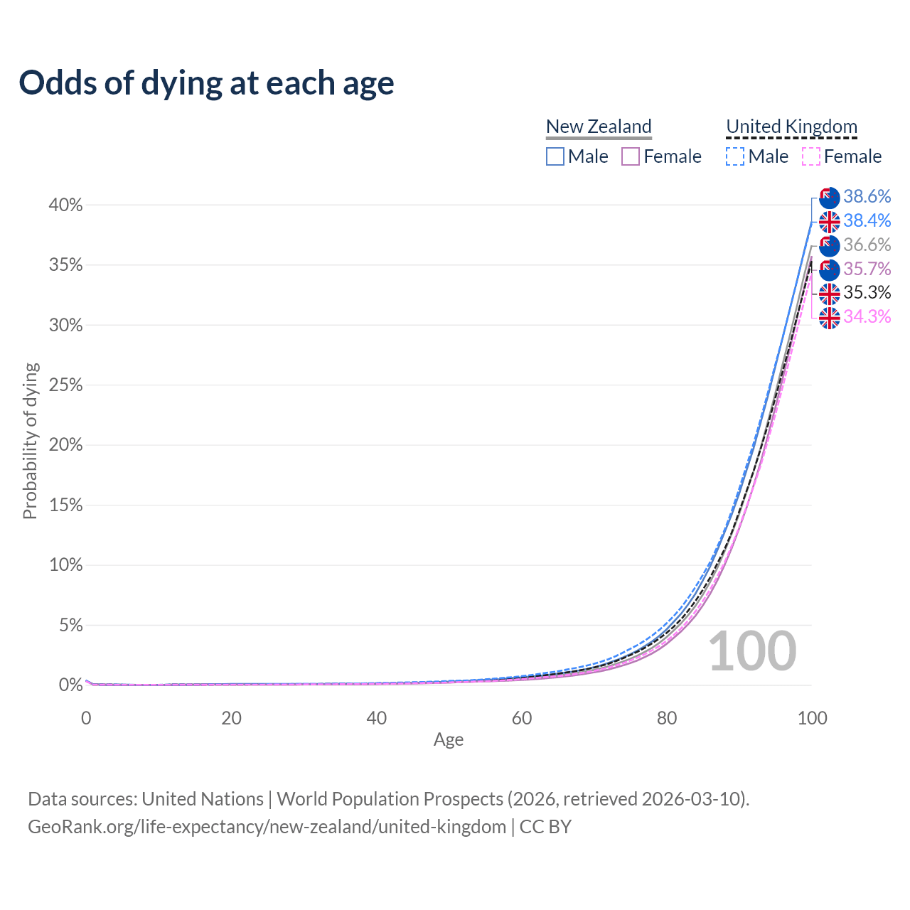 This life expectancy calculator shows the odds of living to 100, 95, 90, and below based on current age for both males and females in New Zealand and the United Kingdom, along with mean and median age of death. The calculations are based on the 2026 life tables (actuarial tables) from the UN World Population Prospects.