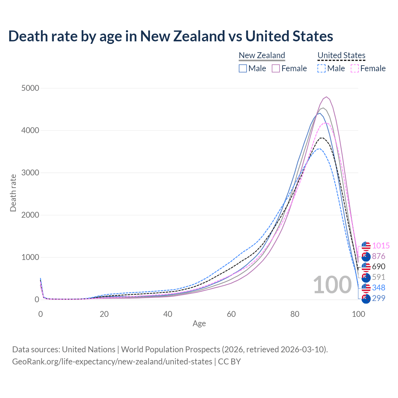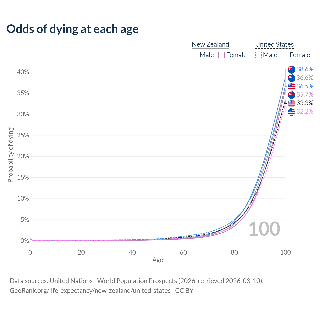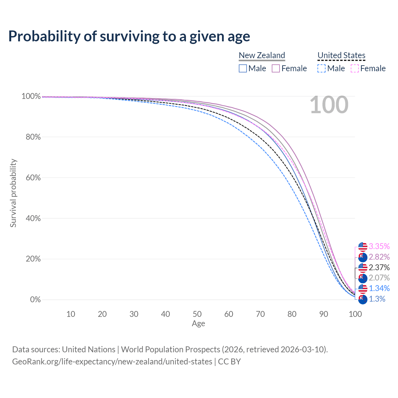 This life expectancy calculator shows the odds of living to 100, 95, 90, and below based on current age for both males and females in New Zealand and the United States, along with mean and median age of death. The calculations are based on the 2026 life tables (actuarial tables) from the UN World Population Prospects.