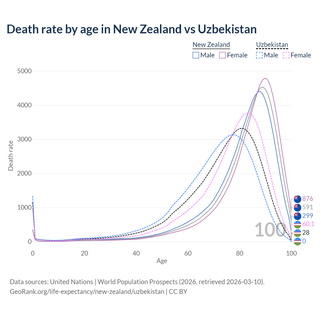 In New Zealand, the most common age of death is 89, compared to 81 in Uzbekistan. The median age of death is 85.8 in New Zealand and 76.4 in Uzbekistan, meaning only half of each cohort is expected to live past that age.