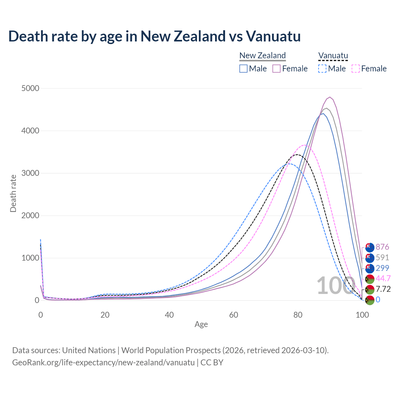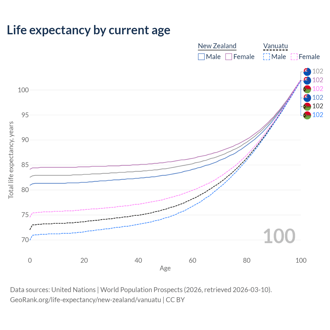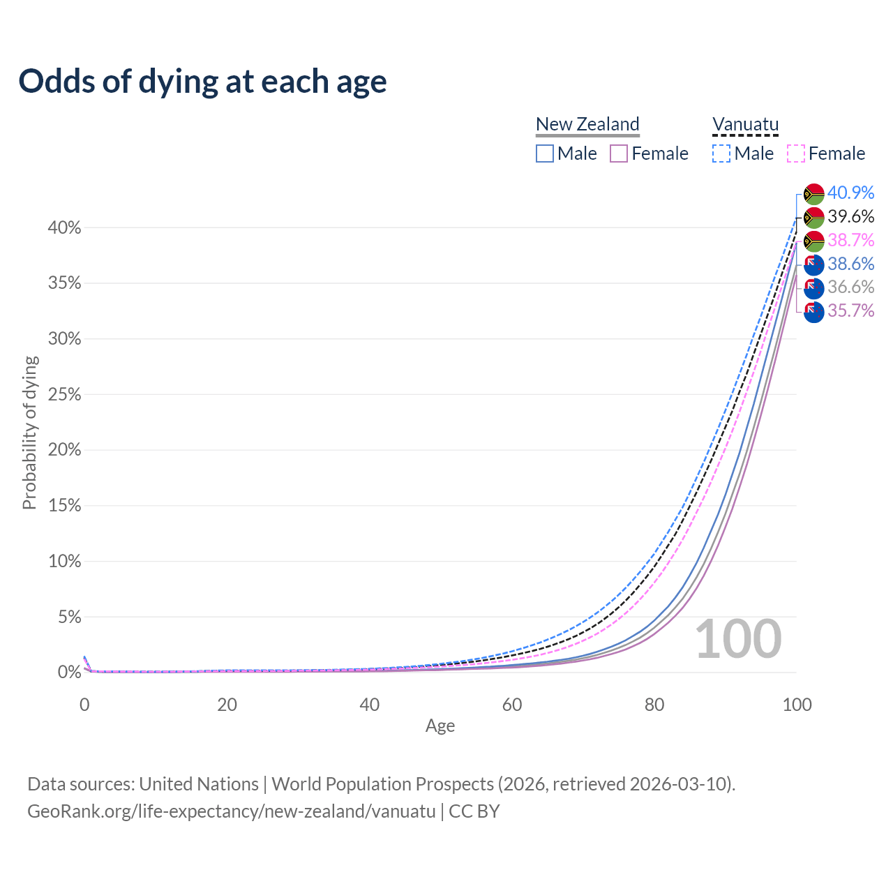 This life expectancy calculator shows the odds of living to 100, 95, 90, and below based on current age for both males and females in New Zealand and Vanuatu, along with mean and median age of death. The calculations are based on the 2026 life tables (actuarial tables) from the UN World Population Prospects.