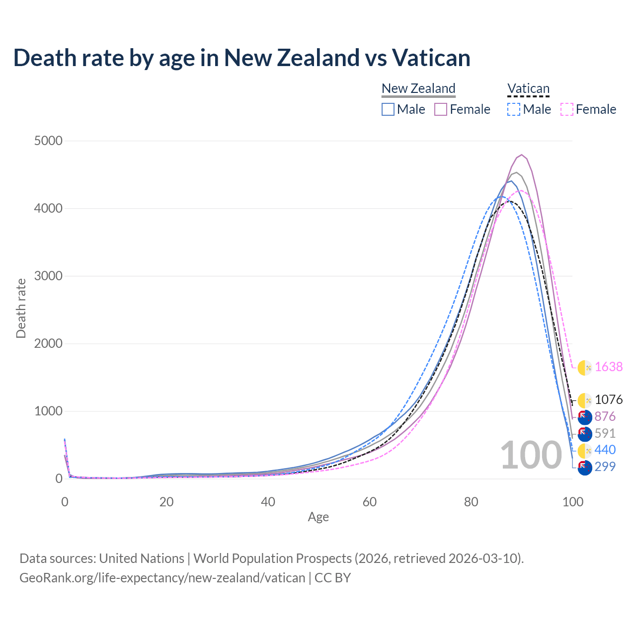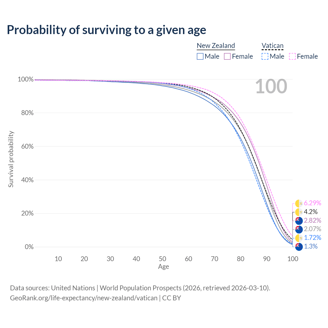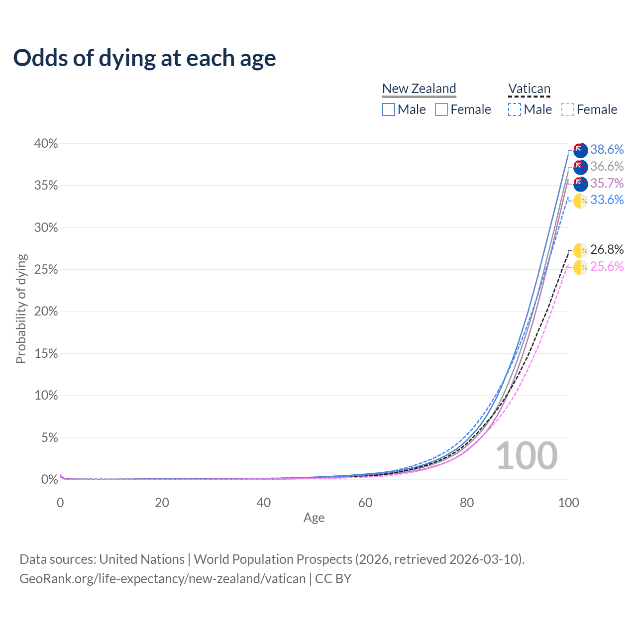 This life expectancy calculator shows the odds of living to 100, 95, 90, and below based on current age for both males and females in New Zealand and the Vatican, along with mean and median age of death. The calculations are based on the 2026 life tables (actuarial tables) from the UN World Population Prospects.