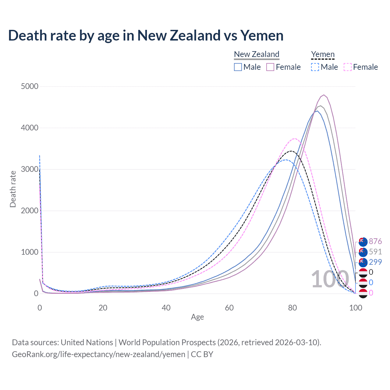 In New Zealand, the most common age of death is 89, compared to 80 in Yemen. The median age of death is 85.8 in New Zealand and 74.9 in Yemen, meaning only half of each cohort is expected to live past that age.