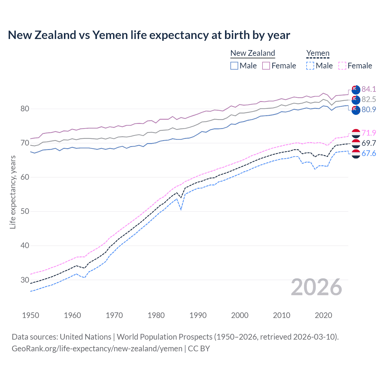The average life expectancy at birth is 82.5 years in New Zealand vs 69.7 in Yemen. New Zealand is ranked 27/197 by life expectancy, and Yemen is 138/197. In New Zealand, the life expectancy is 80.9 years for males and 84.1 years for females. In Yemen, it's 67.6 years for males and 71.9 years for females.