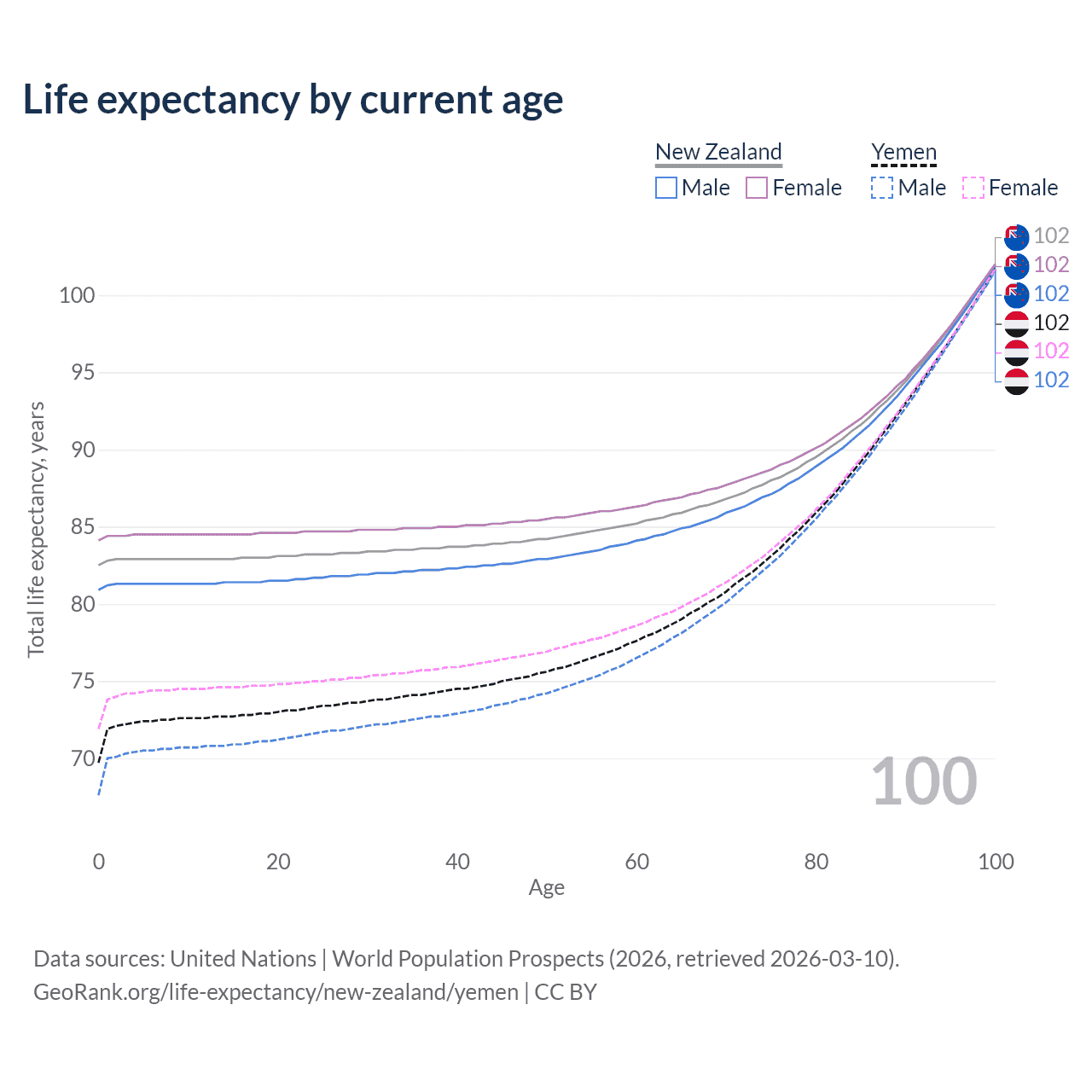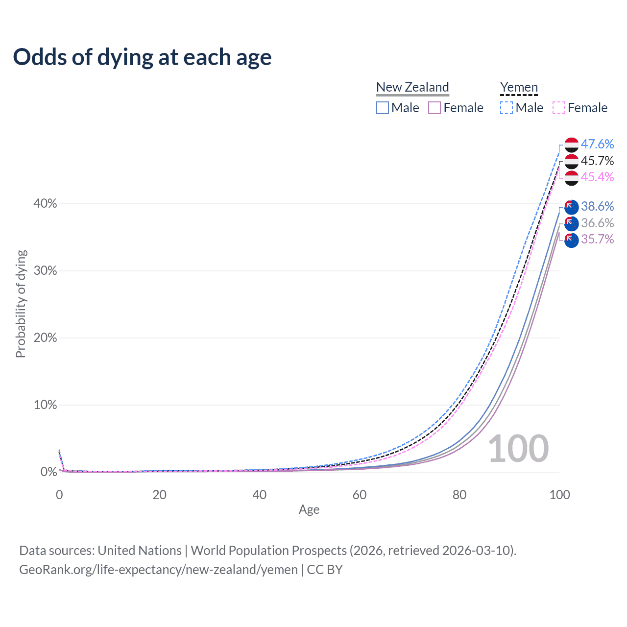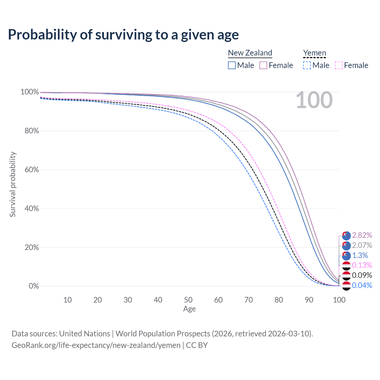 This life expectancy calculator shows the odds of living to 100, 95, 90, and below based on current age for both males and females in New Zealand and Yemen, along with mean and median age of death. The calculations are based on the 2026 life tables (actuarial tables) from the UN World Population Prospects.