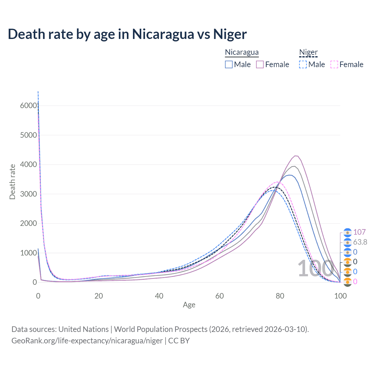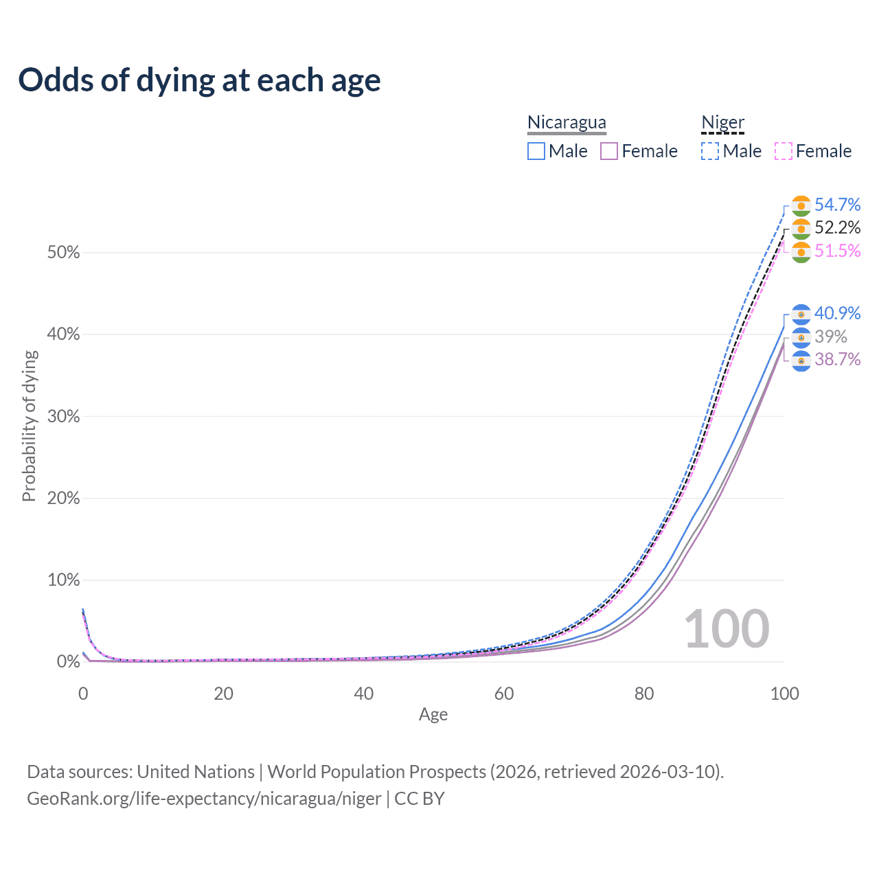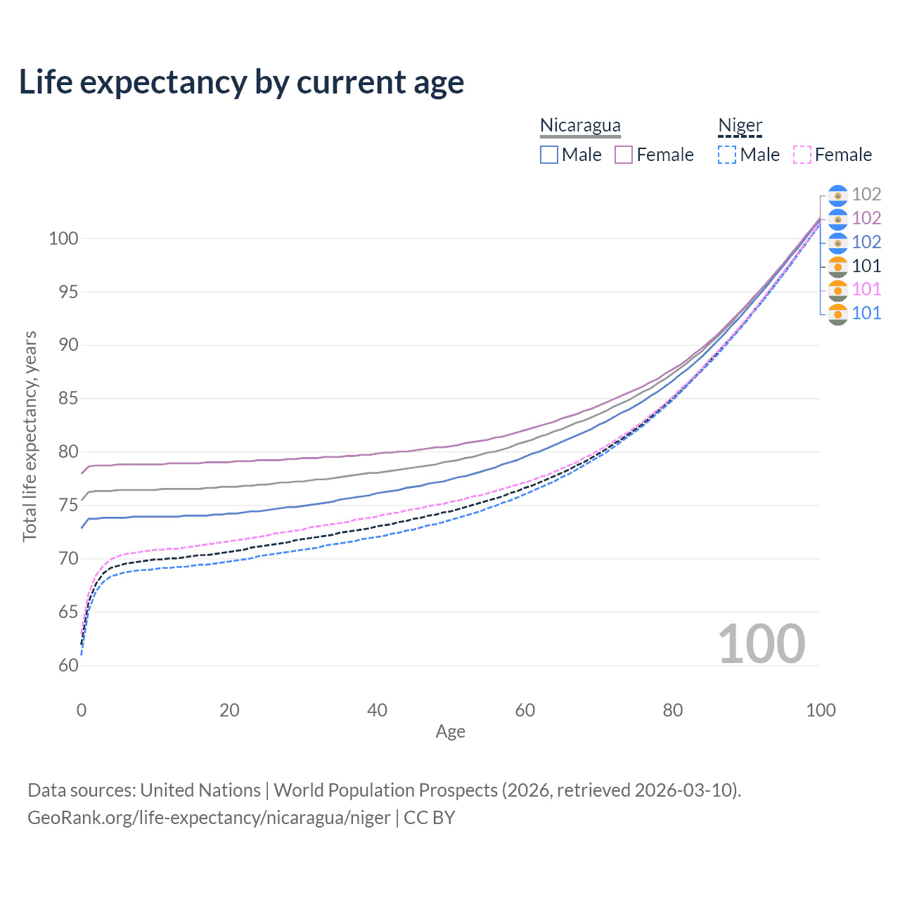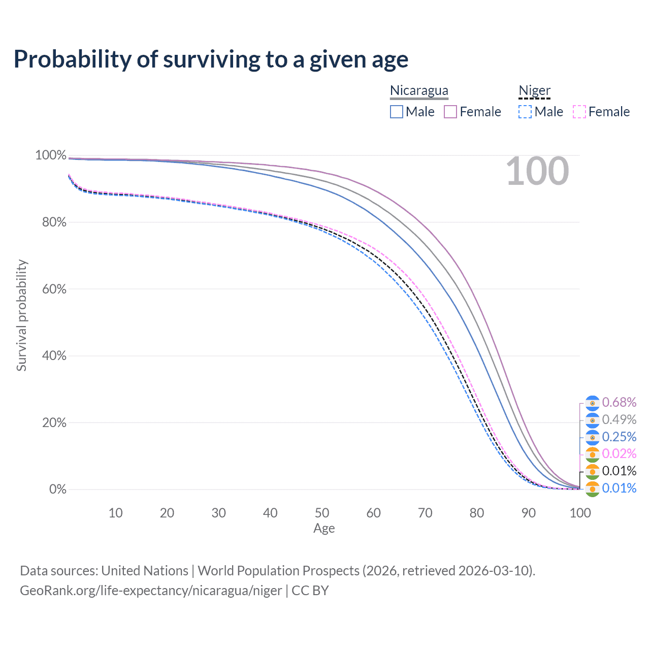 This life expectancy calculator shows the odds of living to 100, 95, 90, and below based on current age for both males and females in Nicaragua and Niger, along with mean and median age of death. The calculations are based on the 2026 life tables (actuarial tables) from the UN World Population Prospects.