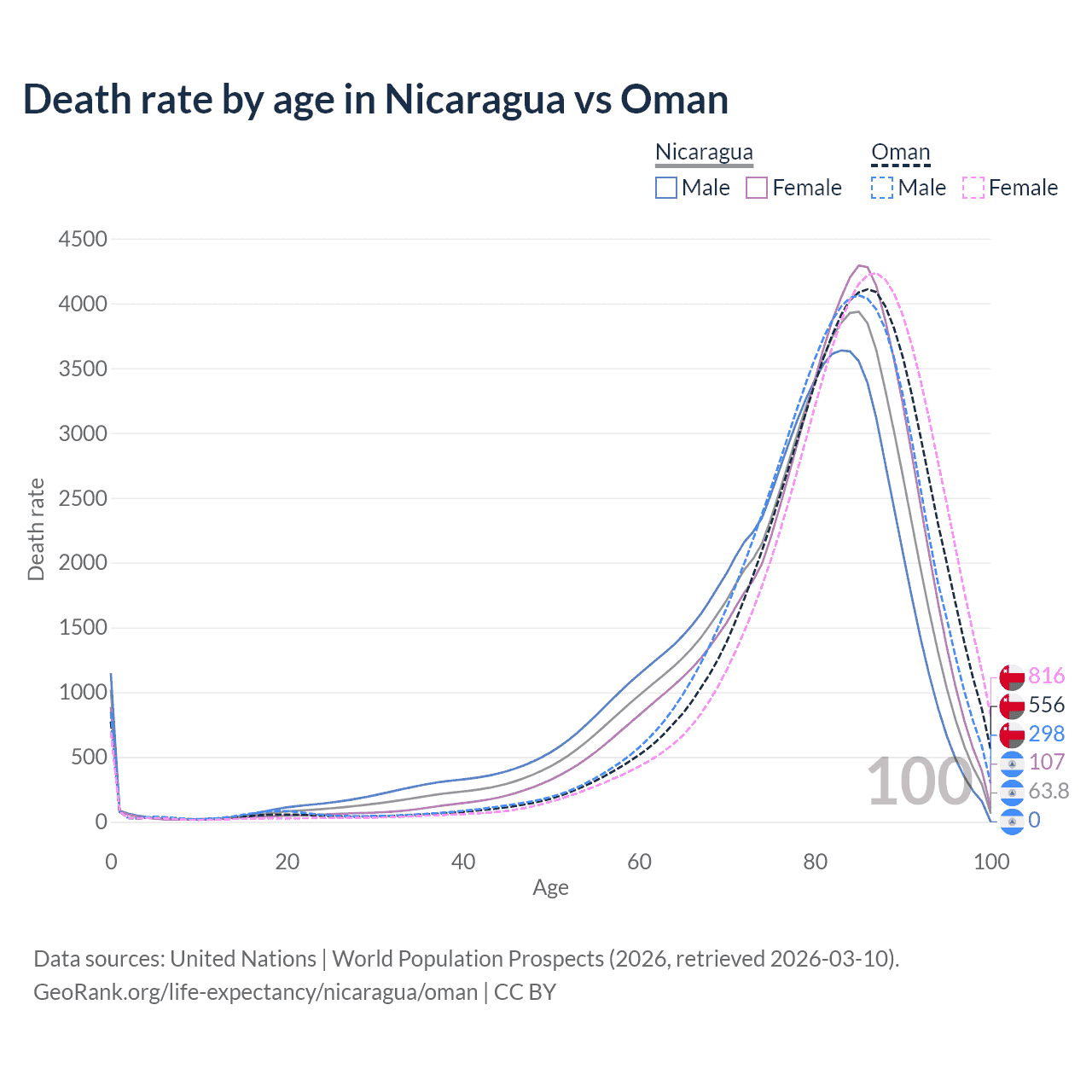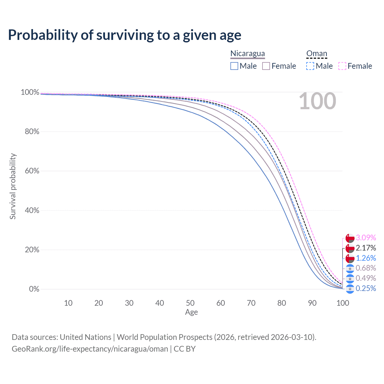 This life expectancy calculator shows the odds of living to 100, 95, 90, and below based on current age for both males and females in Nicaragua and Oman, along with mean and median age of death. The calculations are based on the 2026 life tables (actuarial tables) from the UN World Population Prospects.