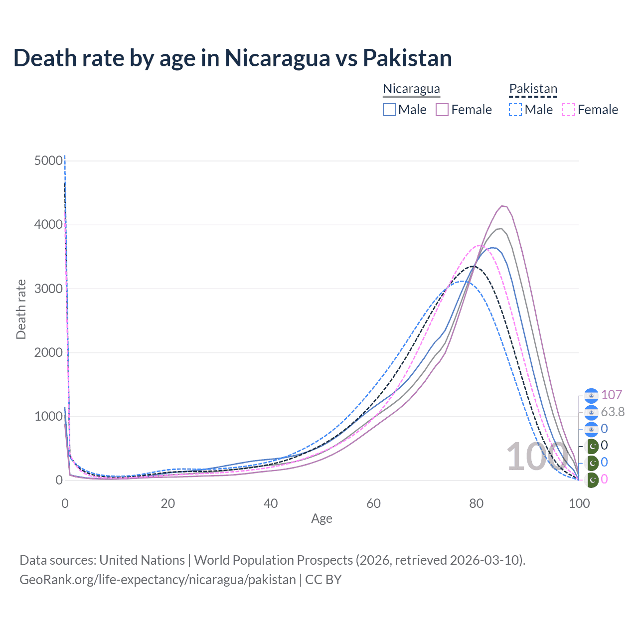 In Nicaragua, the most common age of death is 85, compared to 0 in Pakistan. The median age of death is 79.9 in Nicaragua and 74.3 in Pakistan, meaning only half of each cohort is expected to live past that age.