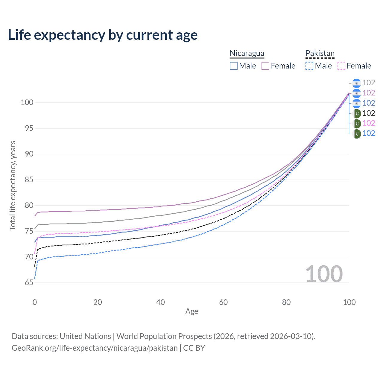 This life expectancy calculator shows the odds of living to 100, 95, 90, and below based on current age for both males and females in Nicaragua and Pakistan, along with mean and median age of death. The calculations are based on the 2026 life tables (actuarial tables) from the UN World Population Prospects.