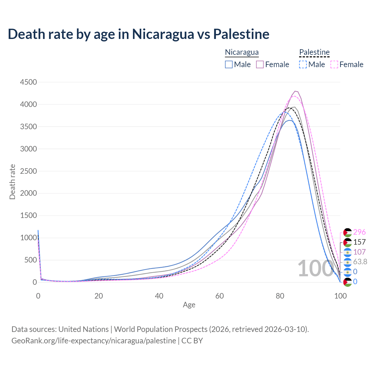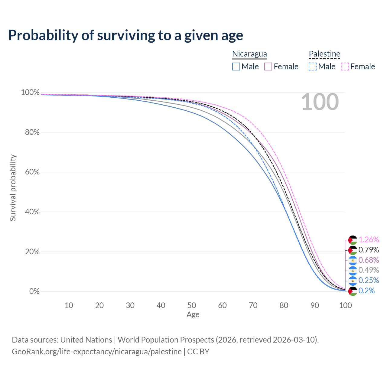 This life expectancy calculator shows the odds of living to 100, 95, 90, and below based on current age for both males and females in Nicaragua and Palestine, along with mean and median age of death. The calculations are based on the 2026 life tables (actuarial tables) from the UN World Population Prospects.