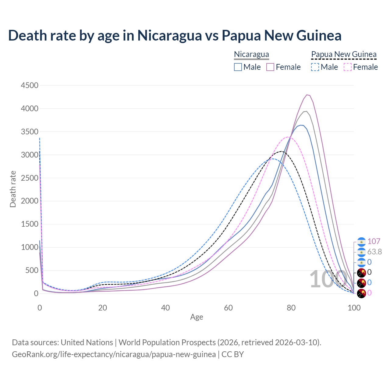 In Nicaragua, the most common age of death is 85, compared to 0 in Papua New Guinea. The median age of death is 79.9 in Nicaragua and 71.7 in Papua New Guinea, meaning only half of each cohort is expected to live past that age.