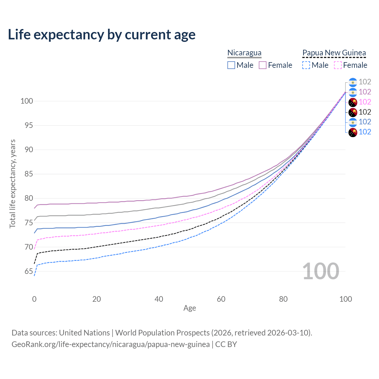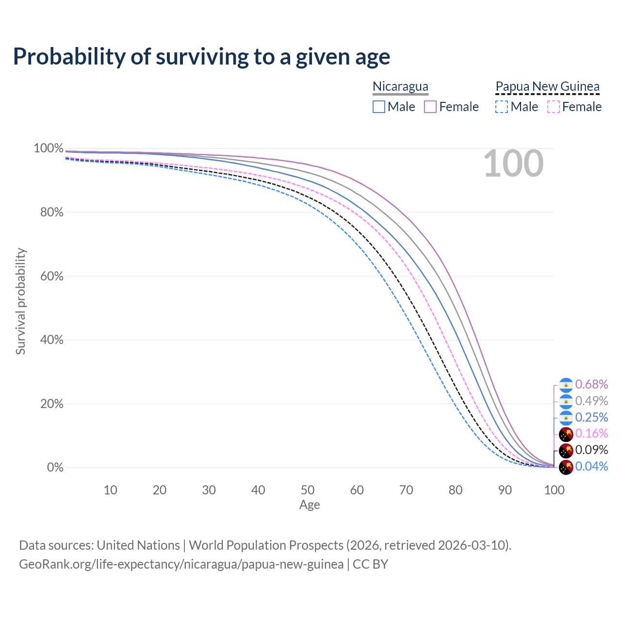This life expectancy calculator shows the odds of living to 100, 95, 90, and below based on current age for both males and females in Nicaragua and Papua New Guinea, along with mean and median age of death. The calculations are based on the 2026 life tables (actuarial tables) from the UN World Population Prospects.