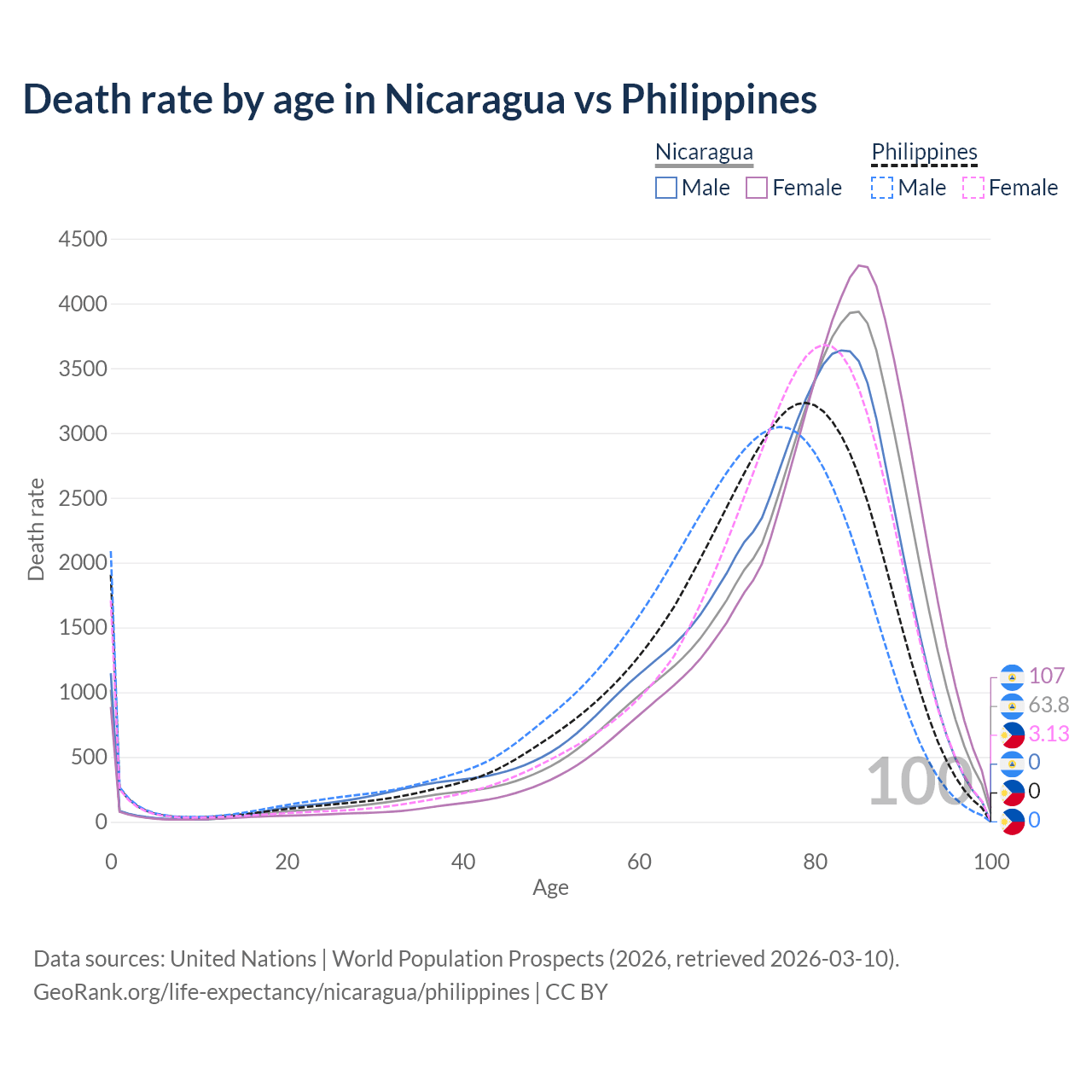 In Nicaragua, the most common age of death is 85, compared to 79 in the Philippines. The median age of death is 79.9 in Nicaragua and 74.6 in the Philippines, meaning only half of each cohort is expected to live past that age.