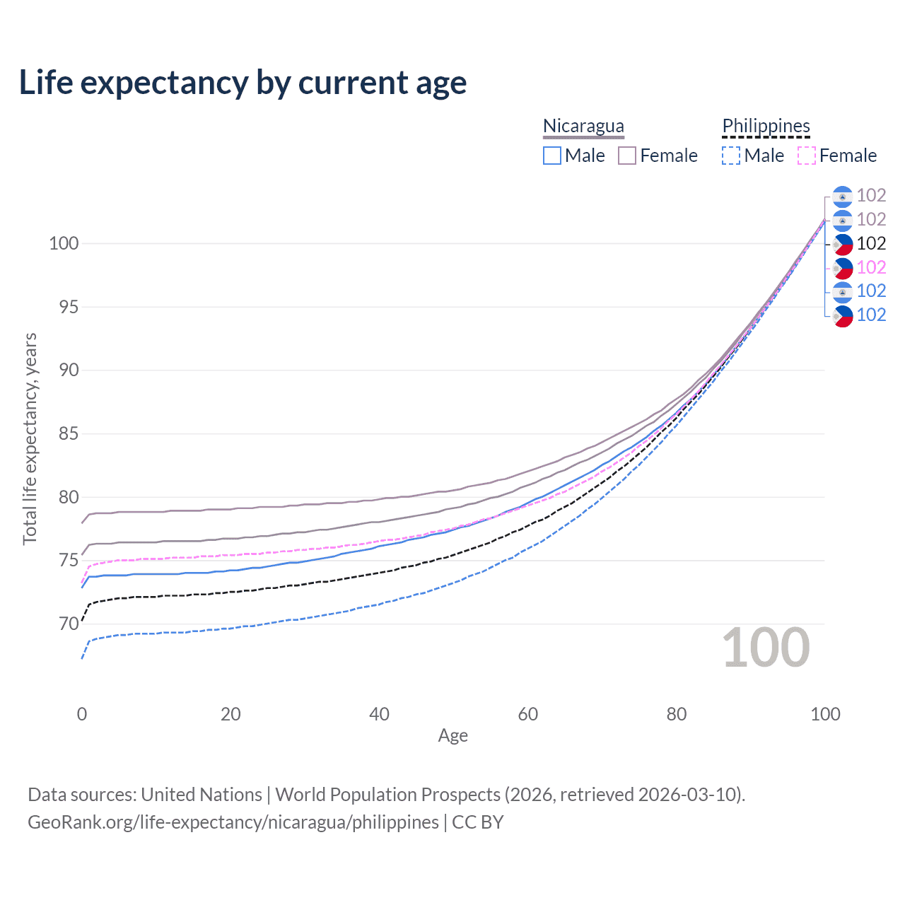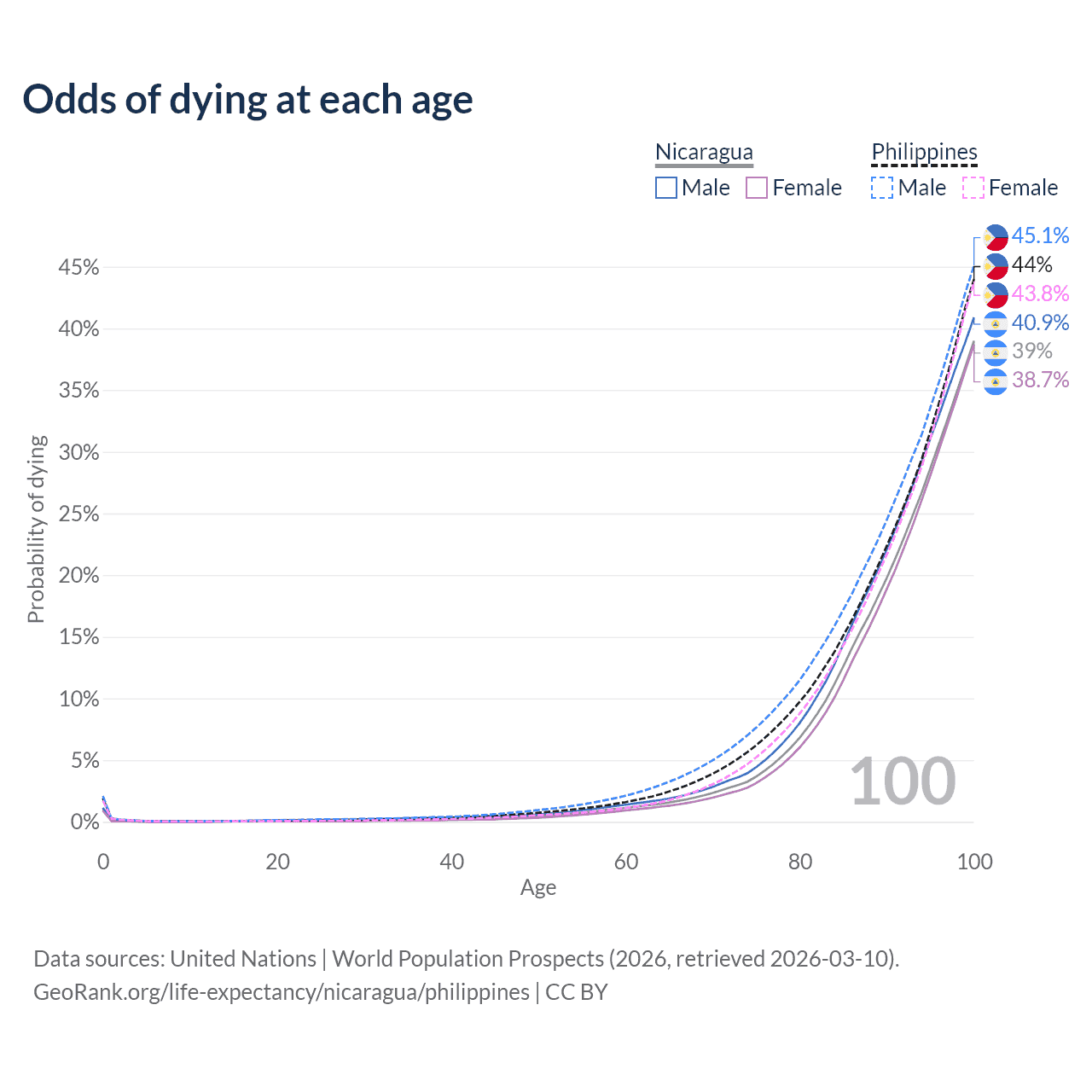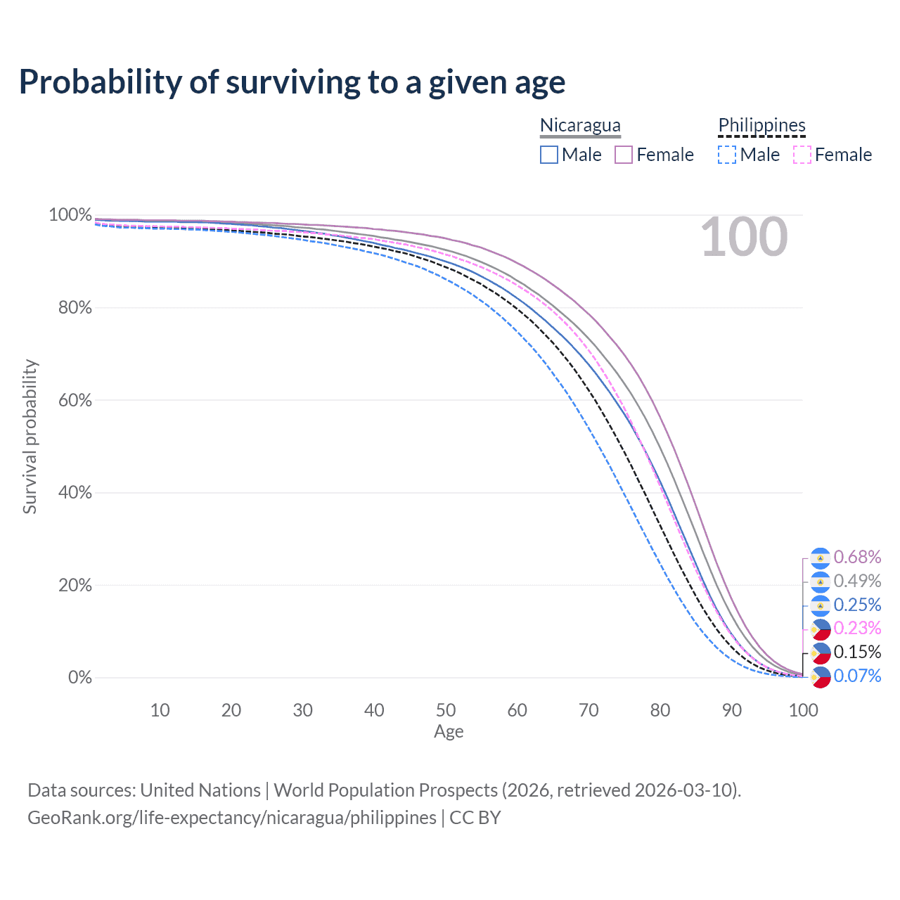 This life expectancy calculator shows the odds of living to 100, 95, 90, and below based on current age for both males and females in Nicaragua and the Philippines, along with mean and median age of death. The calculations are based on the 2026 life tables (actuarial tables) from the UN World Population Prospects.